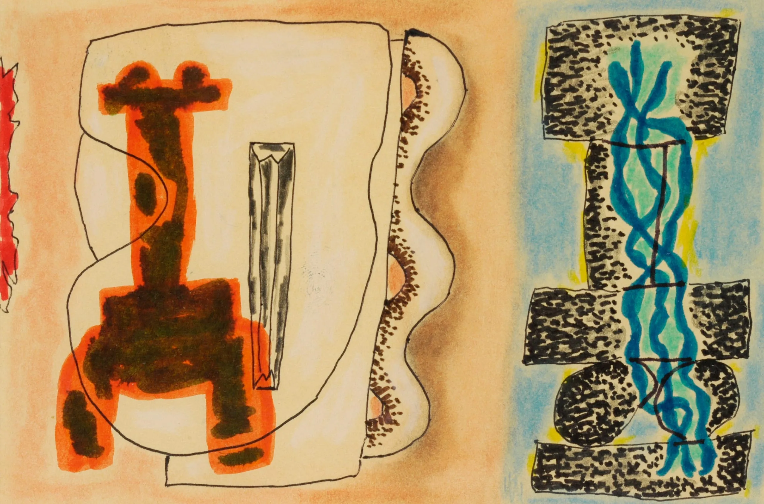 Horizontal abstract drawing in ink and watercolor with three zones: a central tan field with a giraffe-like orange figure, a wavy stippled border, and a right section with stacked textured blocks and blue curving forms on yellow