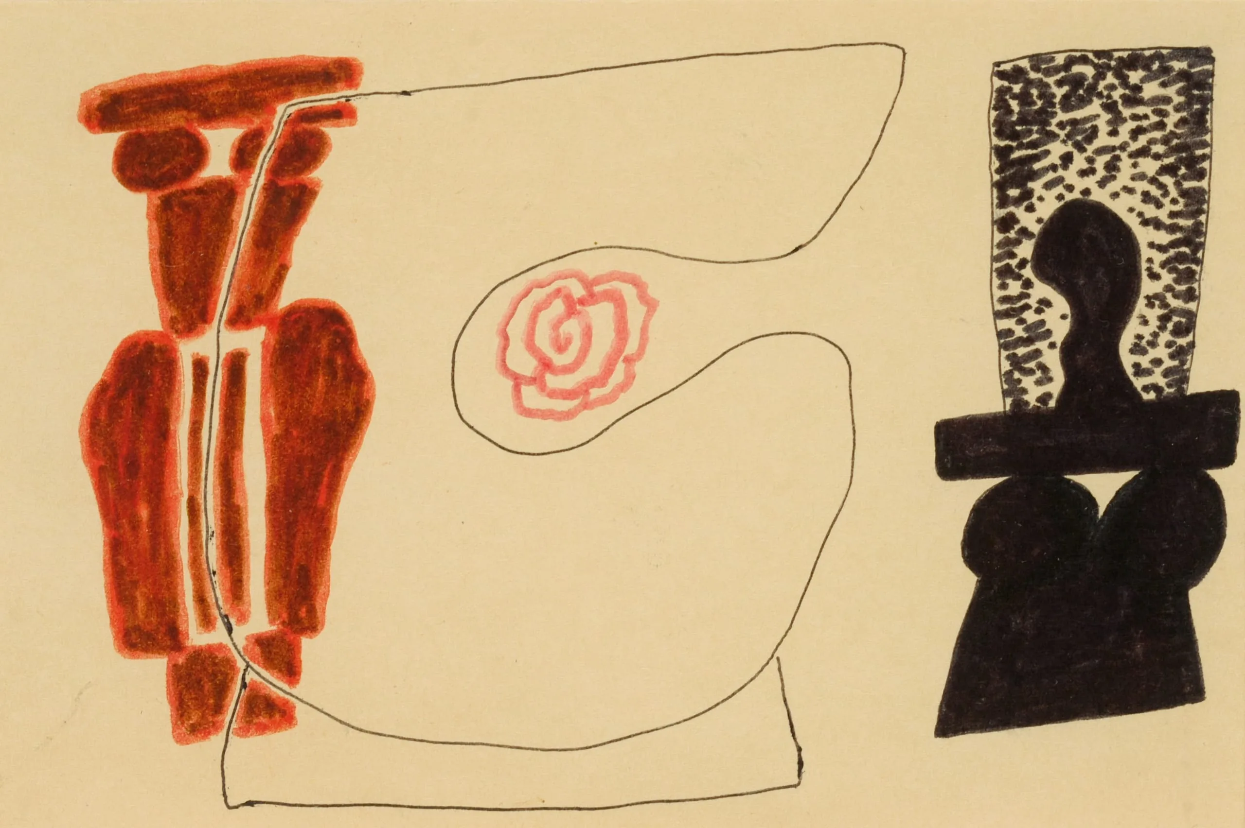 Lithograph on cream paper with three abstracted figures: a brick-red stacked form at left, a biomorphic outline with a spiral rose at center, and a solid black figure topped by a stippled rectangle at right