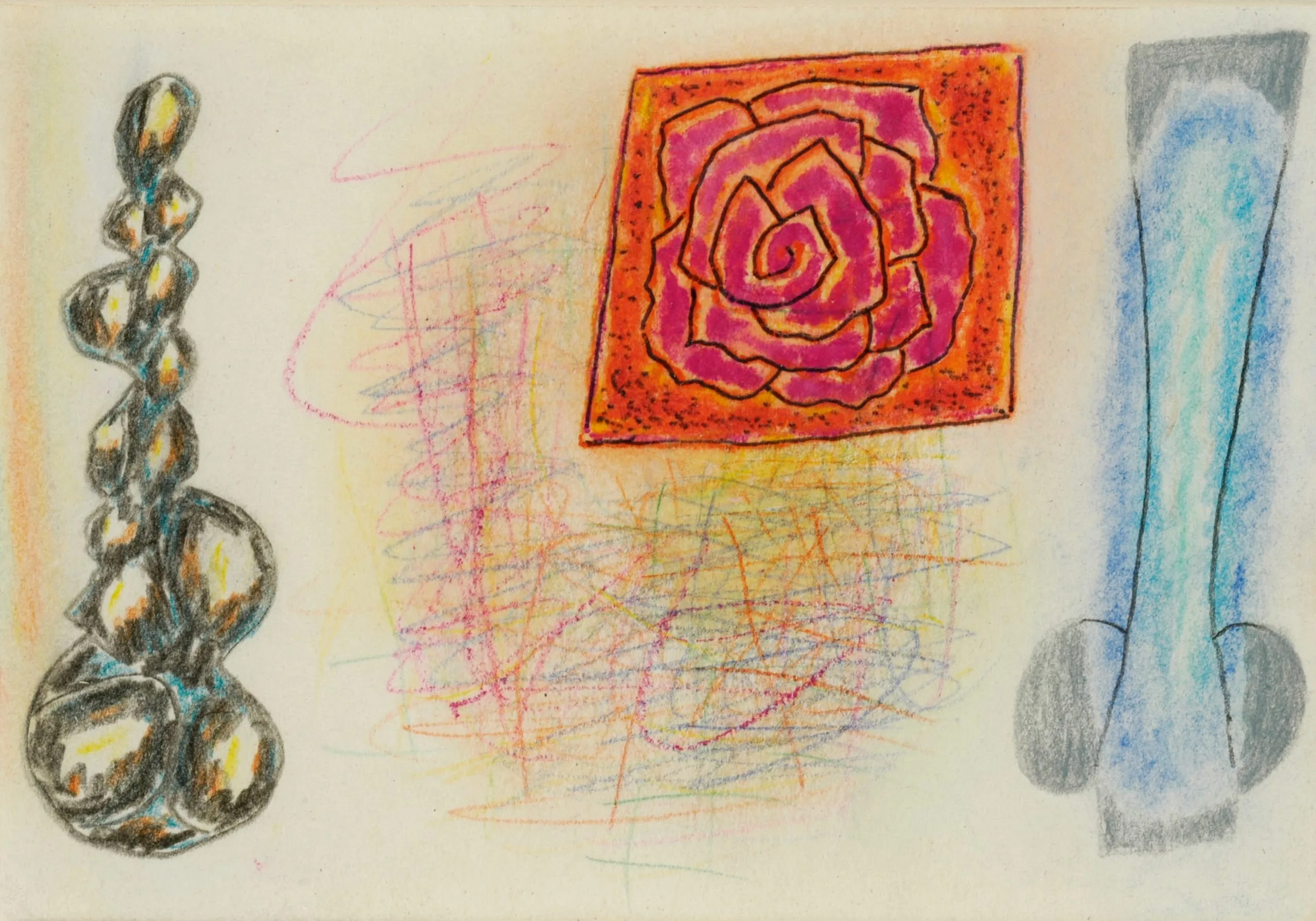 Colored pencil and crayon drawing on cream paper with three motifs: a stacked gray spherical column at left, an orange square containing a magenta spiral rose at center, and a pale blue vertical form at right, with multicolored scribbled lines filling the middle