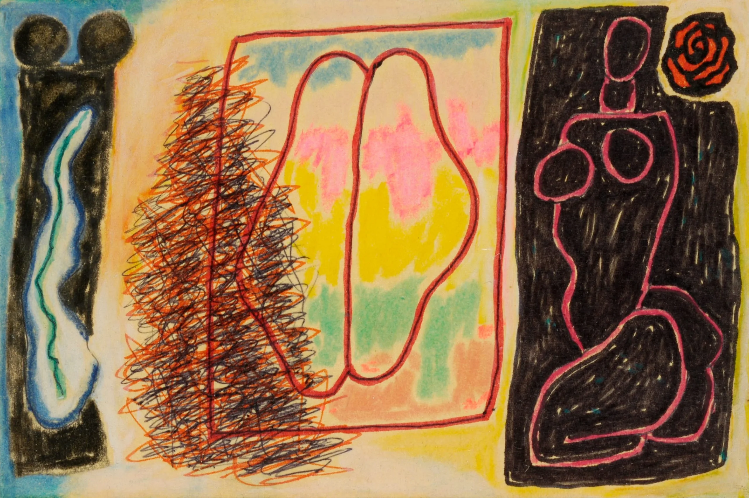 Crayon and pastel drawing with four sections: abstracted black figures at left, dense red-and-black scribbled mass at center-left, red-outlined oval forms in a soft-colored rectangle, and a hot-pink figure outlined against a black panel with a small red rose at upper right
