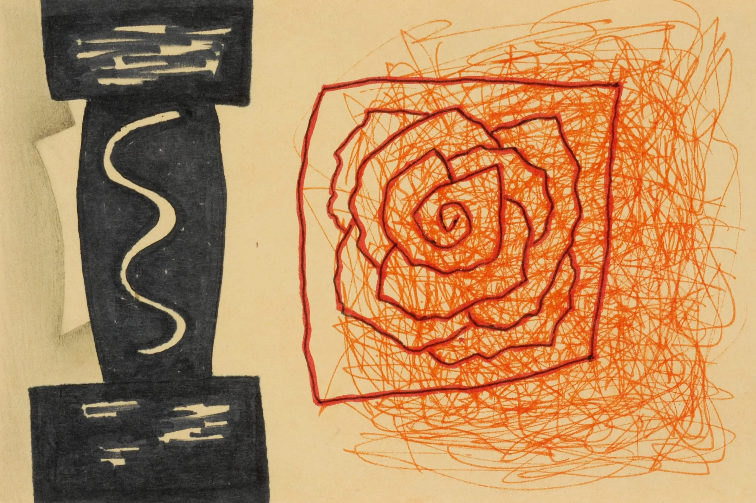 Abstract work on tan paper with a dark ink totem-like column at left and a densely scribbled red and orange spiral at right