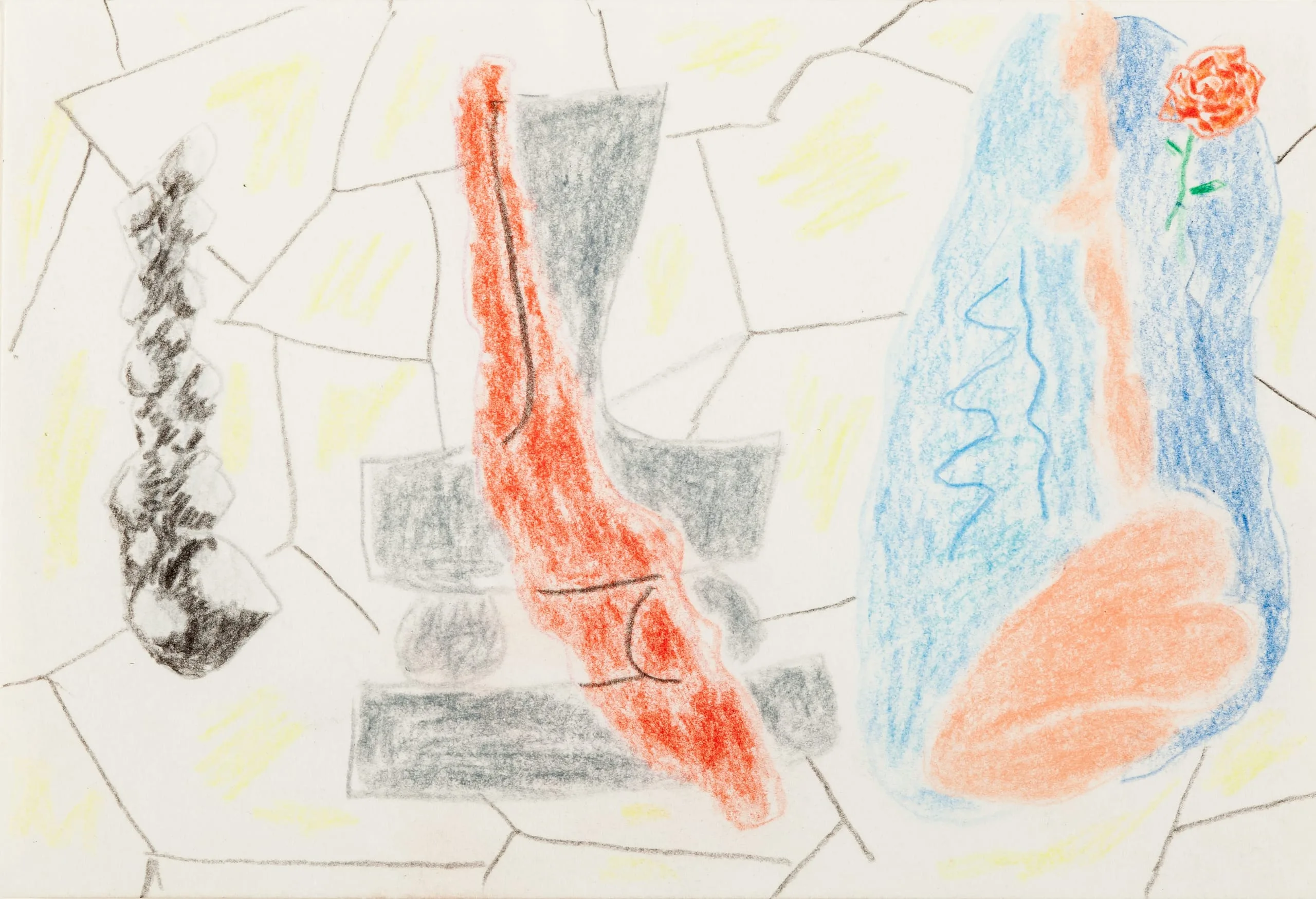 Colored pencil and graphite drawing on white paper, three vertical abstract forms in black, red, and blue-peach with a small red rose, on a background of geometric polygon outlines