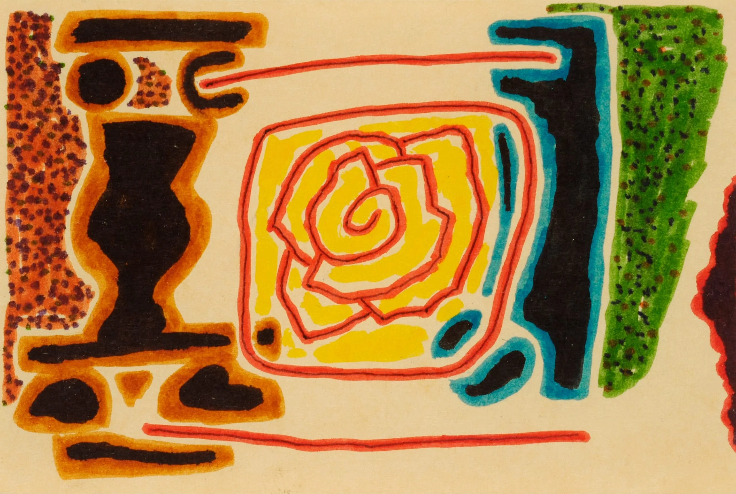 Colorful abstract lithograph or screenprint with a spiral yellow and red square at center, an hourglass black form at left, and speckled orange and green bands at the edges, on cream paper