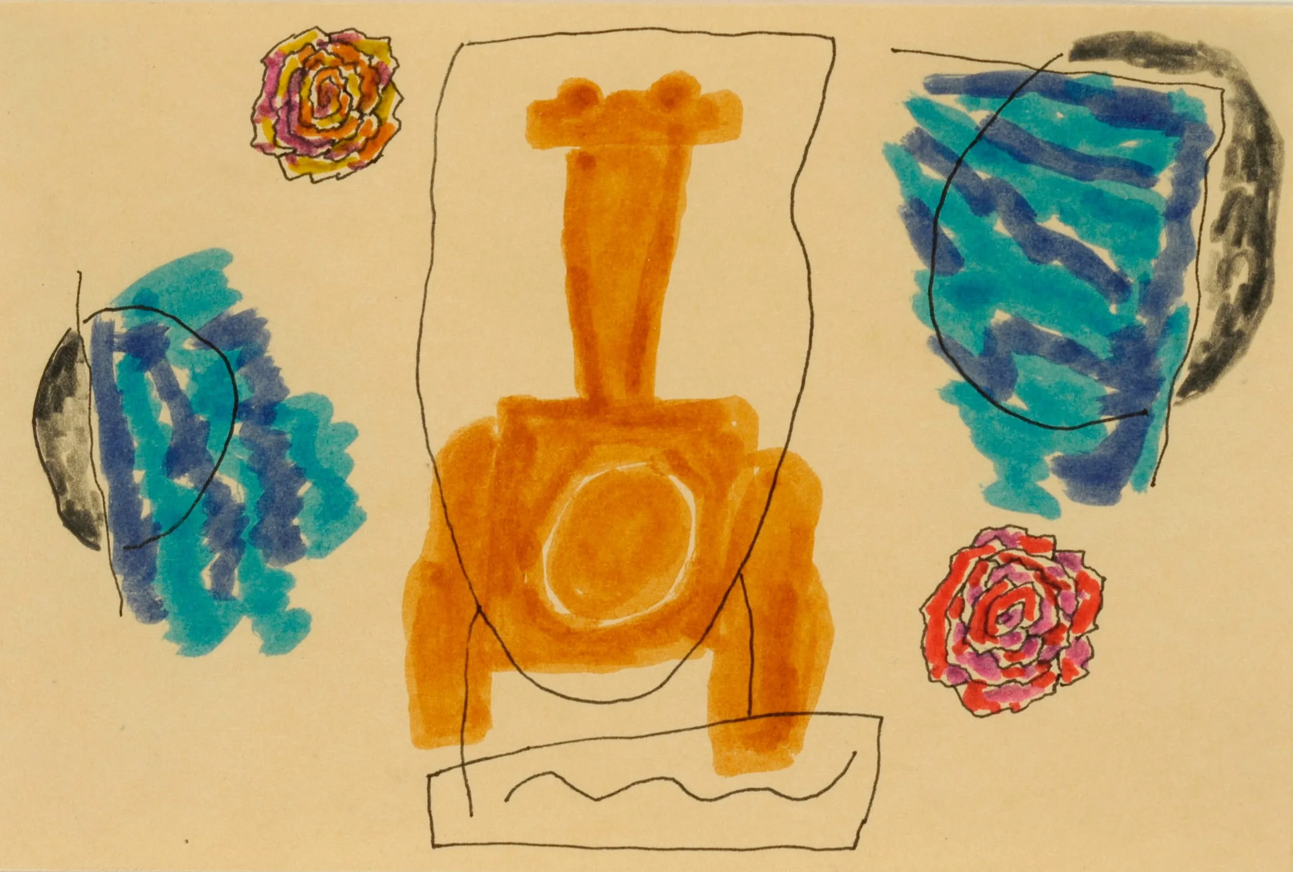 Abstract drawing in ink and watercolor on cream paper with a central orange figure-like form, two blue-and-gray circular shapes, and two spiraling rose forms