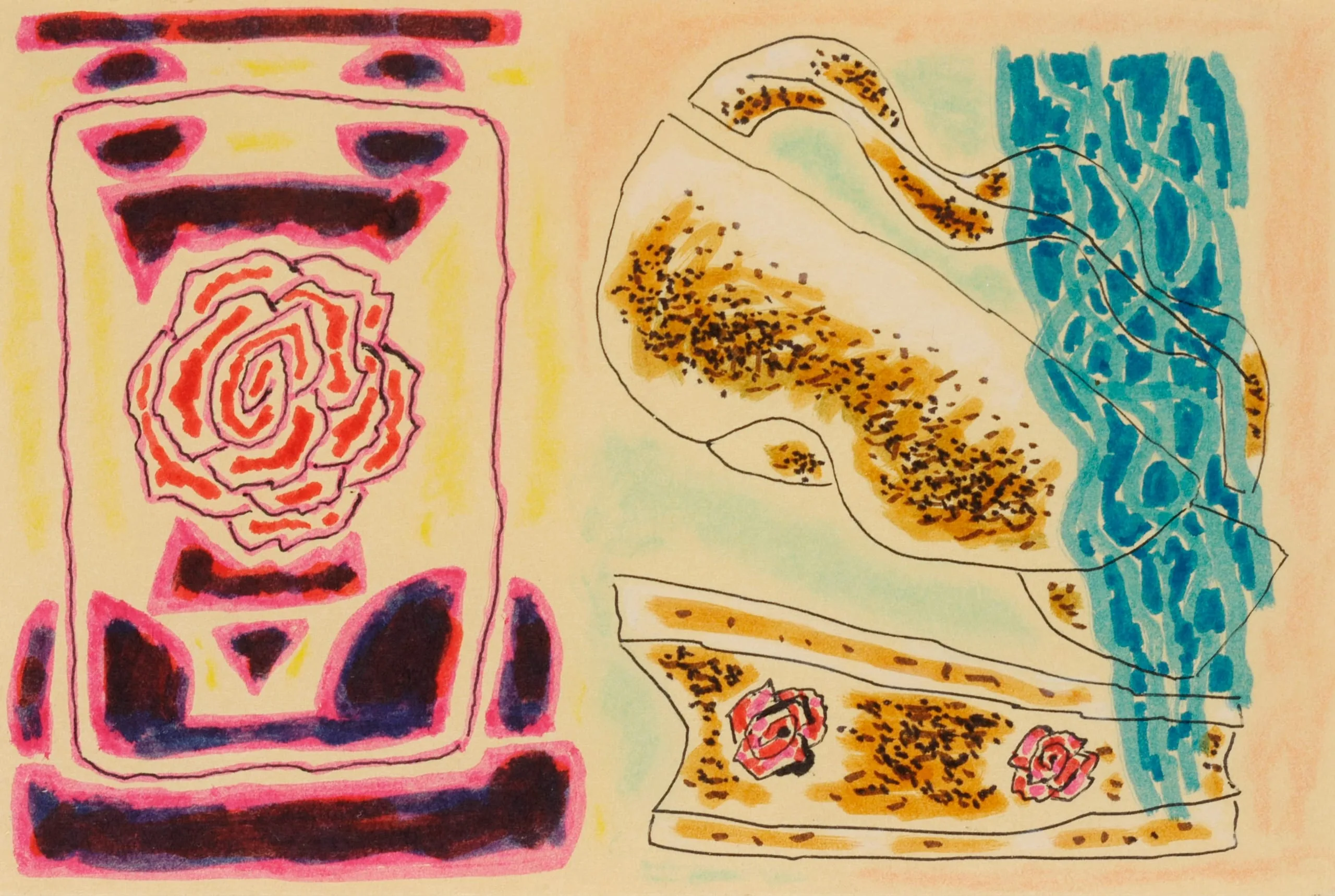 Horizontal print with two zones: left shows a totem-like pink and navy form with a large spiral rose; right shows organic black-outlined shapes with amber dot-filled areas, teal brushwork, and two small roses