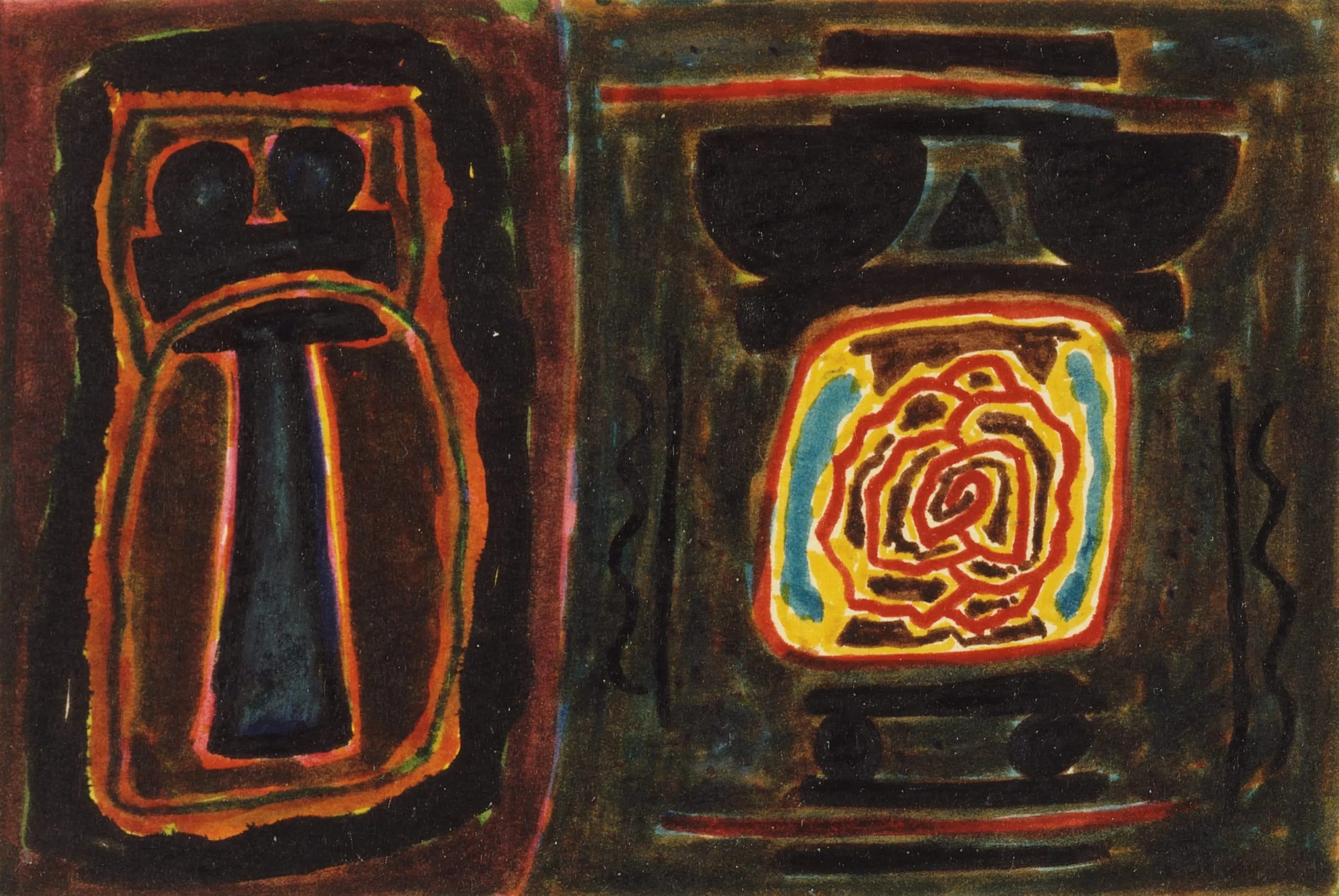 Abstract painting divided into two dark panels, left with a totem-like vertical form in crimson and black, right with a glowing spiral in red, orange, and yellow on a near-black ground