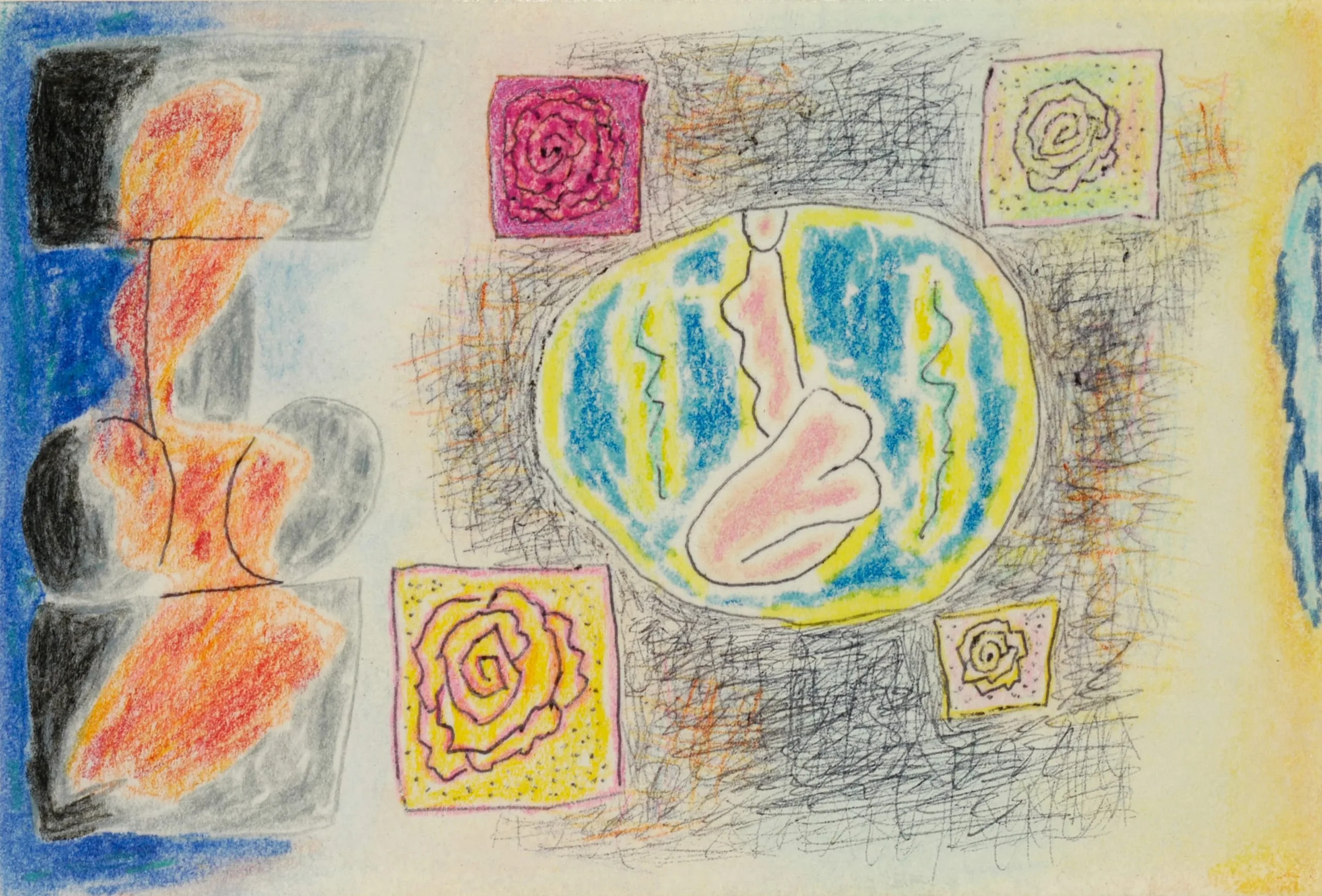 Colored pencil and graphite drawing with a central oval in blue and yellow enclosing a seated figure outline, surrounded by four small square panels each containing a spiral rose motif