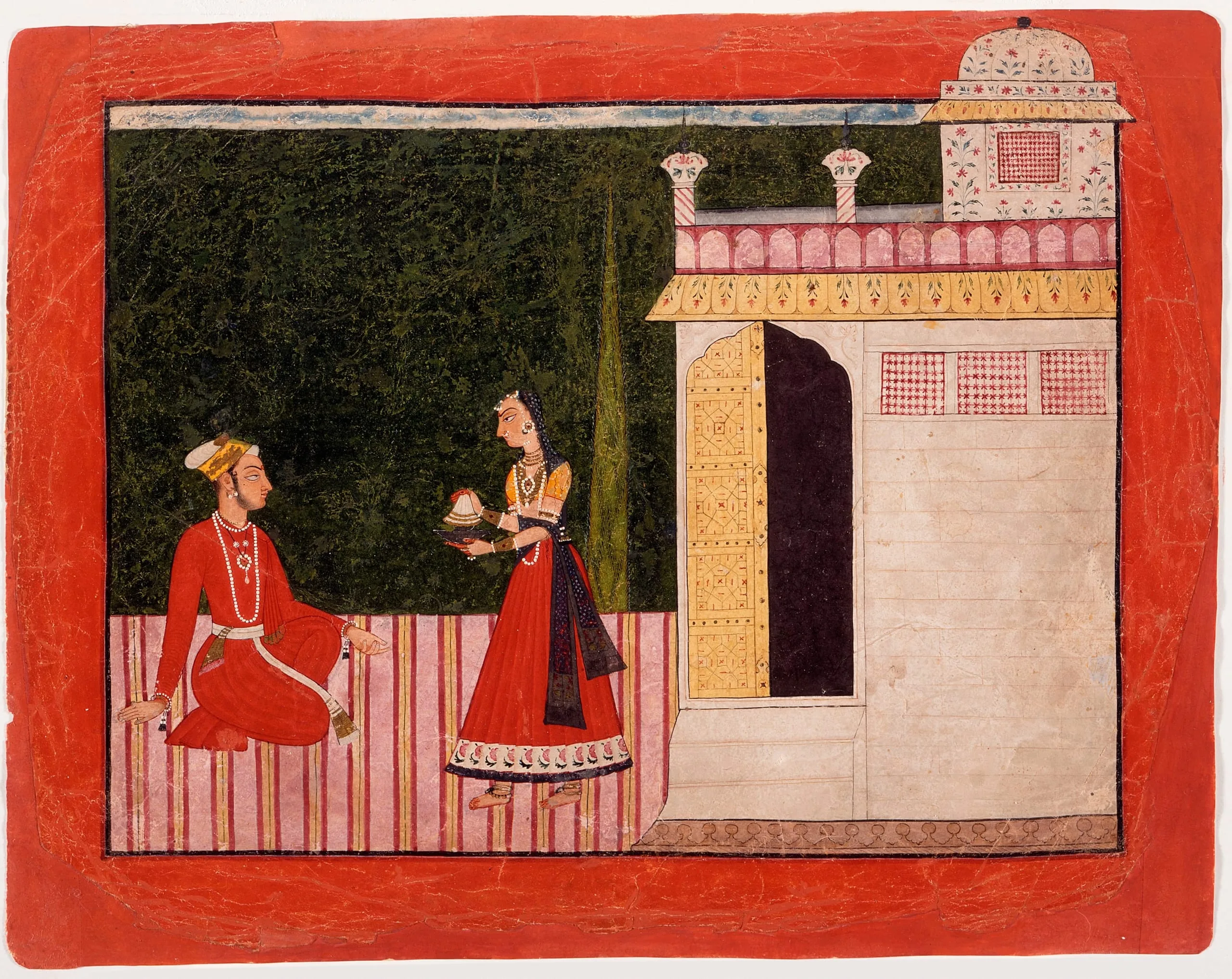 Malkos Raga is the second raga in all the ragamala (garland of melodies) classification systems. It is a sublime melody associated with midnight and late winter (December–January). It is one of the least distinctive ragas but is often personified as a hero or prince seated in or near a pavilion with a courtly woman. The couple is typically partaking of betel nut quids (pan). A woman (or women) sometimes holds an honorific fly whisk. Here, the hero is kneeling on a terrace with a striped carpet beside a white pavilion with floral decoration. A woman offers him a dish of betel nut quids. A lone cypress tree stands against a dark background indicating that it is a nighttime melody. See also M.71.1.22 and M.83.105.12.