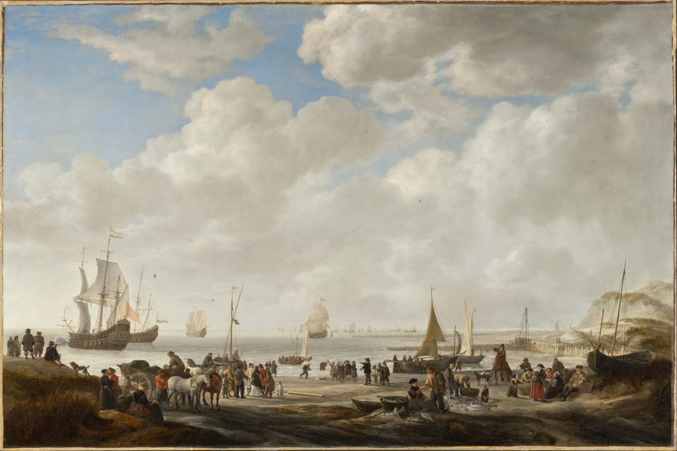Possibly Johanna van den Berch (Bergh), Amsterdam and Achtienhoven, widow of Gerard Stijls (d. 1673), provost of the College of the Admiralty of Amsterdam, later wife of Justus van Sonsbeeck, sheriff of Achtienhoven, by 9 Feb. 1678, as “f.46 (1) een Tesselstrant van Jan de Vlieger.”(2) Possibly John Stewart (sale, London, Barford, 11 Mar. 1783, lot 59, as “A sea view on the coast of Holland, acalm, with a variety of shipping and boats; a very brilliant and transparent picture, in high preservation,” sold for £48.6). Probably George Watson Taylor (1770–1841), London and Erlestoke Mansion near Devizes, Wiltshire (sale, London, Christie’s, 13 June 1823, lot 51, as “A Harbour with Boats near a Strand, and a Ship firing a Salute, a Fisherman in the front ground; the Scene is enlivened by a beautiful sky. An Admirable Picture for richness of colour and transparent effect,” sold for £131.5 to); Lawley, (3) 18 Grosvenor Square, London. T. A. Carlyon, Bournemouth (estate sale, London, Christie’s, 4 Oct. 1946, lot 83, as “The Arrival of the Prince of Orange, at Flushing,” sold for £483 to); [D. Katz, Dieren]. [A. Kaufmann, London, in 1946]. [Alfred Brod, London, 1952]. Mrs. M. D. Langloh-van den Bergh, Wassenaar (sale, London, Sotheby’s, 10 Dec. 1980, lot 82, sold to); [David Koetser, Geneva, sold 1981 to]; Mr. and Mrs. Edward William Carter, Los Angeles, given 1995 to; LACMA.