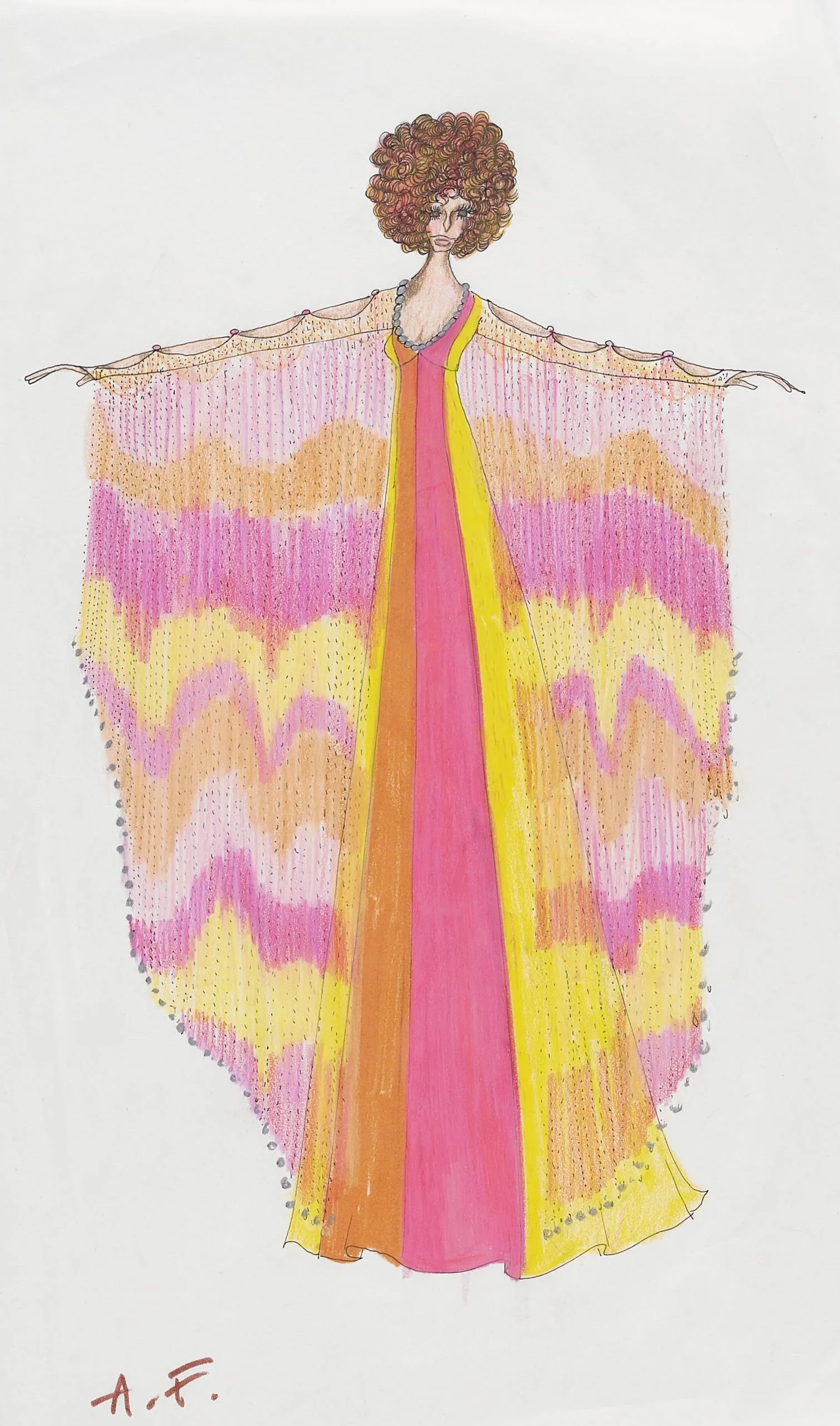 Fashion illustration in marker and ink showing a woman from behind wearing a floor-length pink and yellow gown beneath a wide, fringed cape with zigzag wave pattern in pink, orange, and yellow