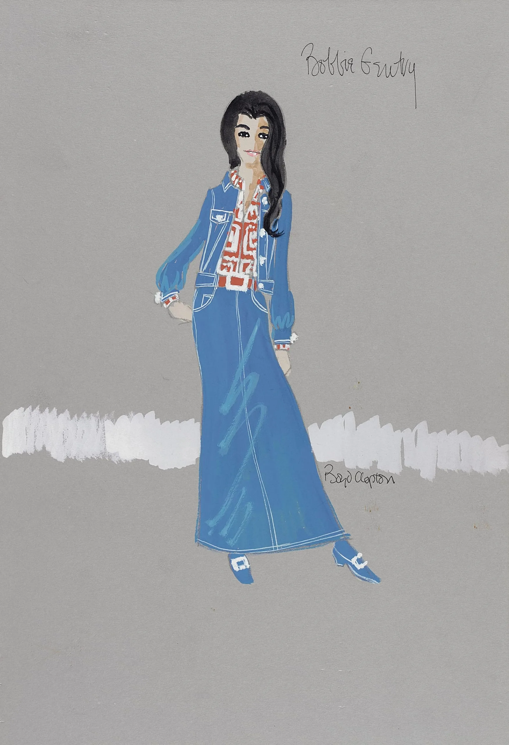 Gouache fashion illustration on gray paper, full-length female figure in a cornflower-blue denim jacket and maxi skirt over a red geometric-print blouse