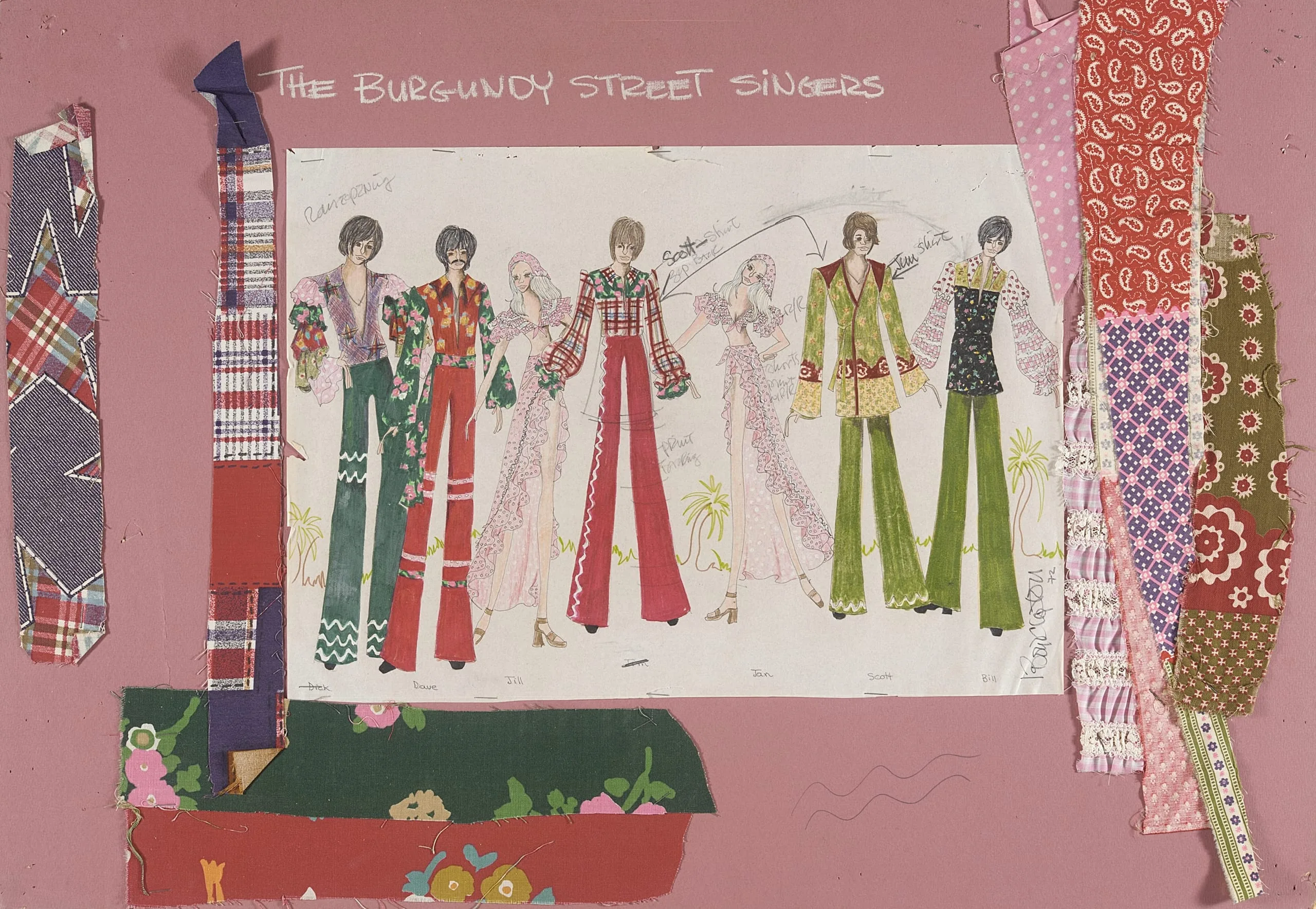 Costume design board with fabric swatches on rose-pink backing, featuring a central color illustration of seven figures in 1970s bell-bottom ensembles, labeled 'THE BURGUNDY STREET SINGERS'