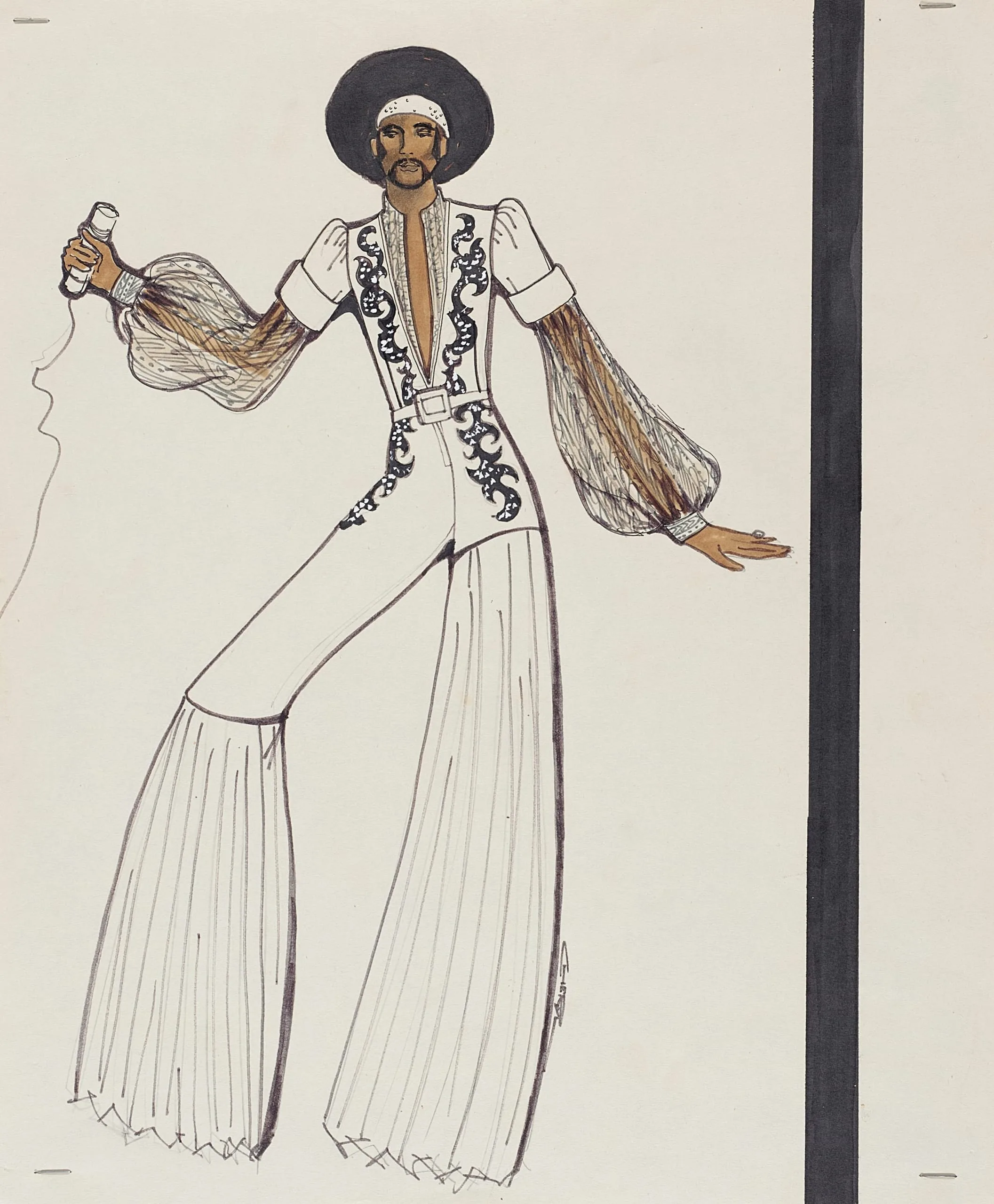 Fashion illustration in black ink and color marker on off-white paper, full-length figure in a white jumpsuit with wide flared trousers, sheer amber sleeves, and scrolling black trim, wearing a wide-brimmed hat and holding a microphone