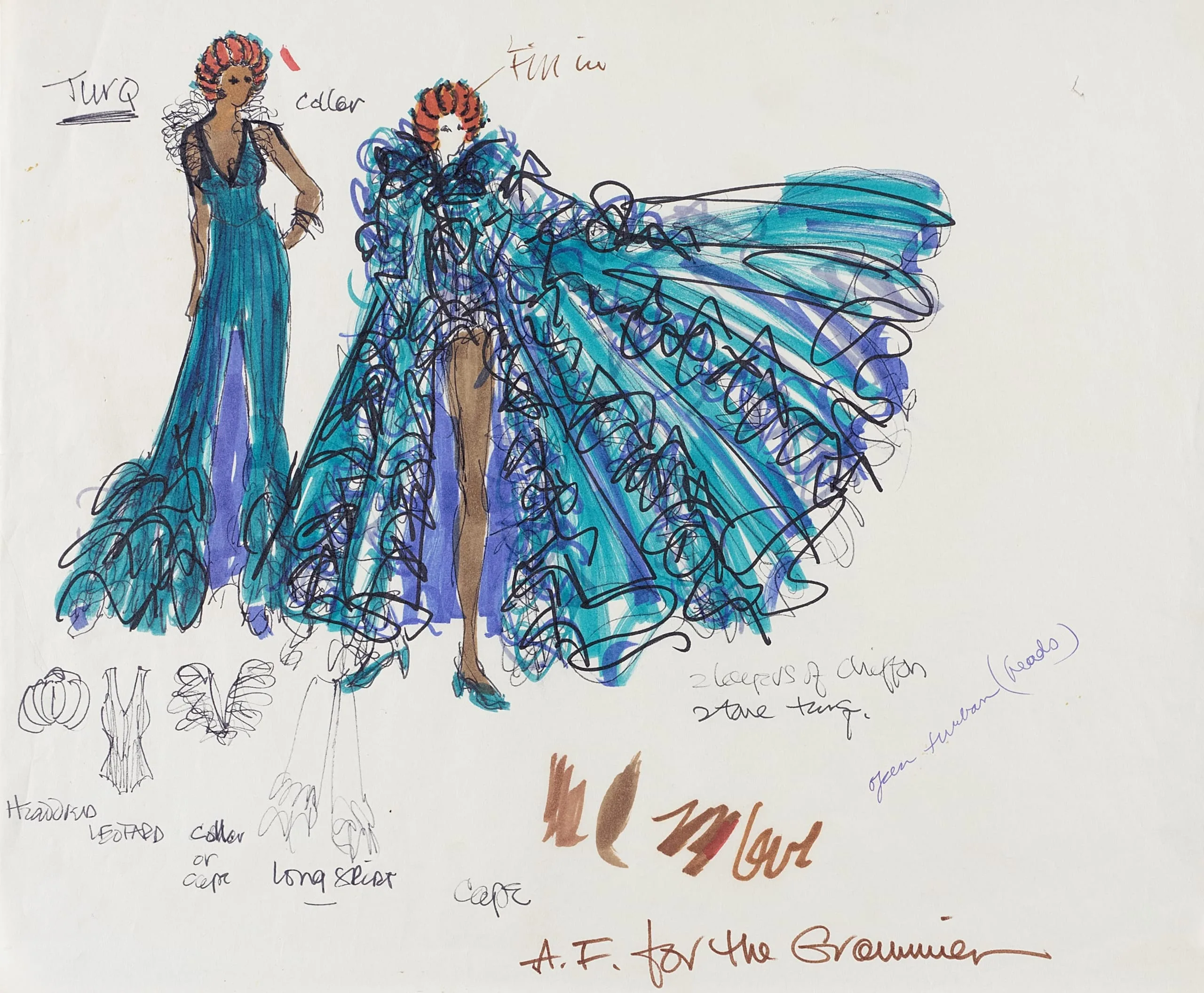 Fashion design drawing in marker and pencil on cream paper, two full-length costume figures with voluminous teal and blue ruffled garments, handwritten annotations and 'A.F. for the Grammies'