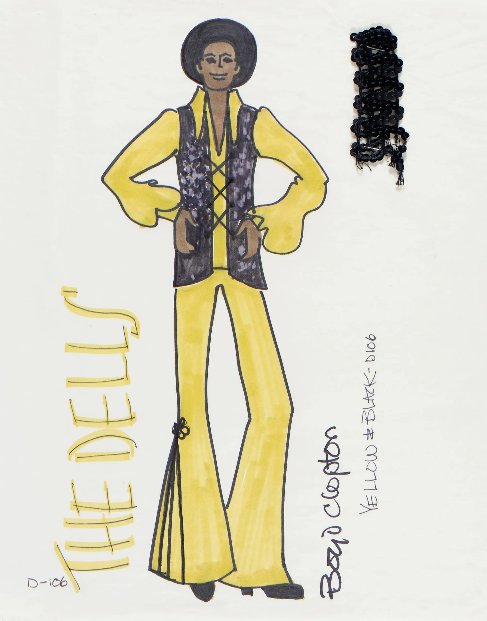 Marker and ink costume design drawing of a full-length male figure in a yellow bell-sleeve shirt, black sequined vest, and yellow bell-bottom trousers, with fabric swatch and handwritten annotations