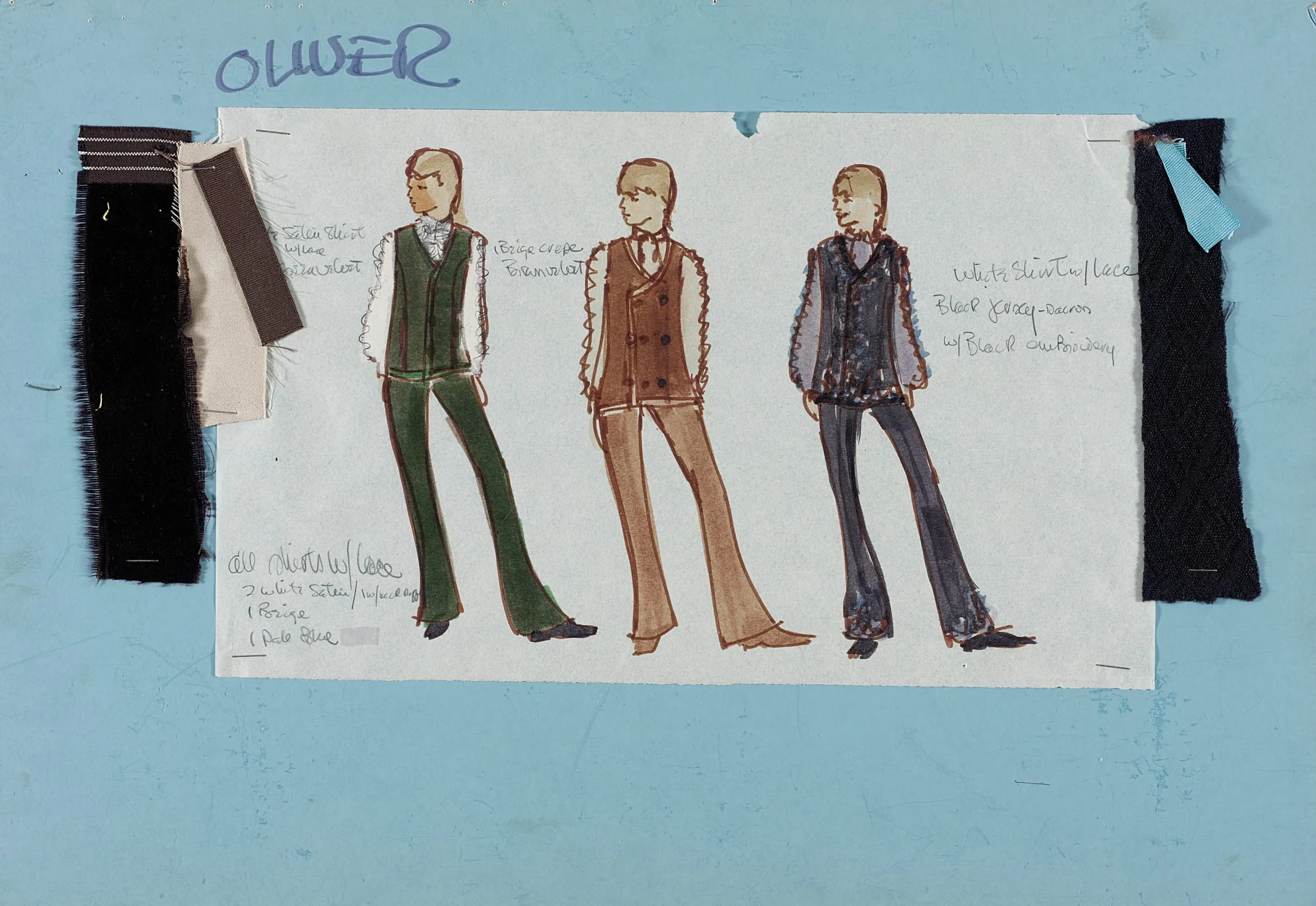 Costume design drawing in ink and watercolor showing three full-length male figures in 1970s-style wide-leg suits in green, brown, and navy, with fabric swatches attached to blue cardstock backing