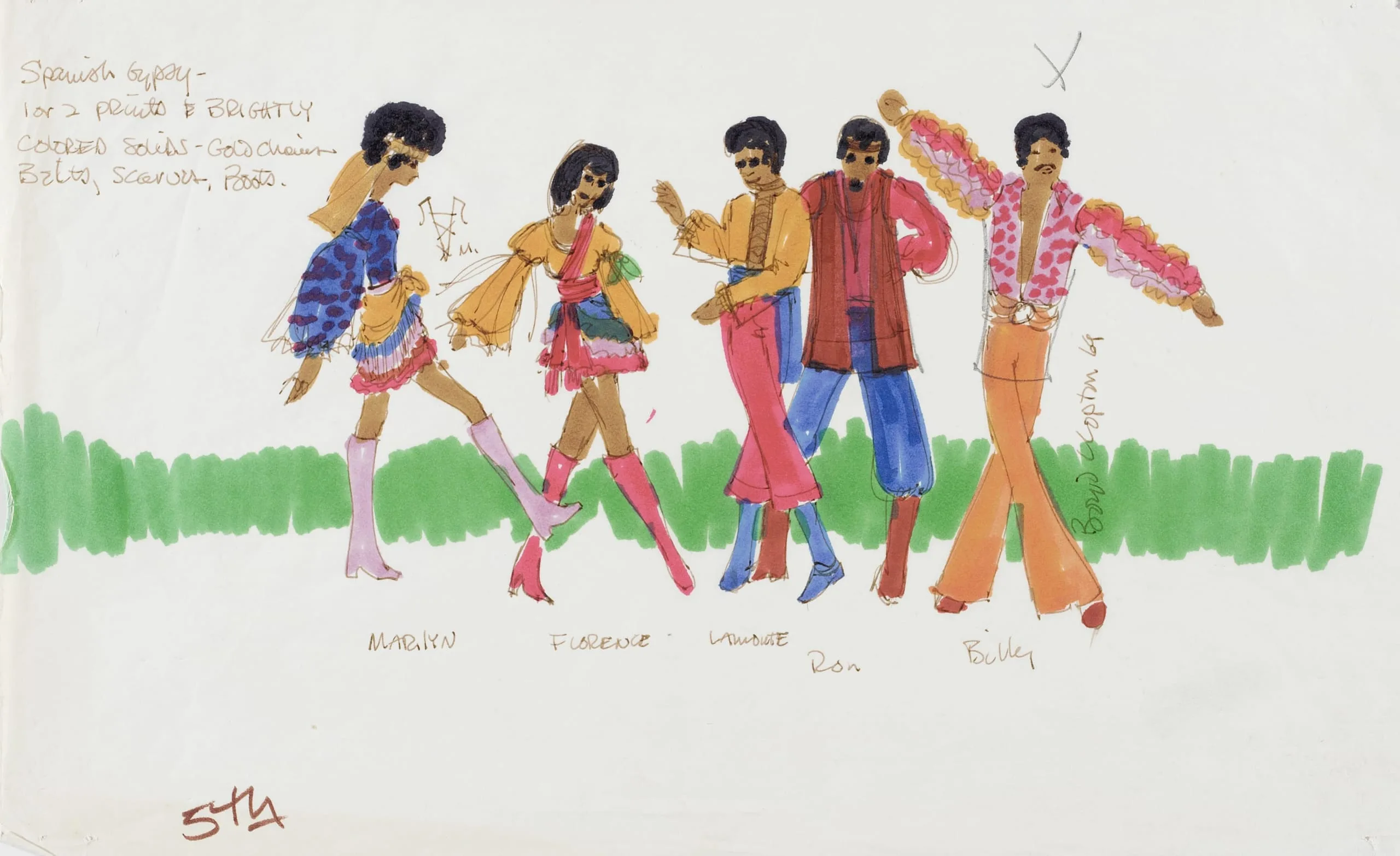 Costume design drawing in ink and watercolor, five figures in brightly colored 1970s outfits with afros, labeled with character names, with handwritten notes in upper left