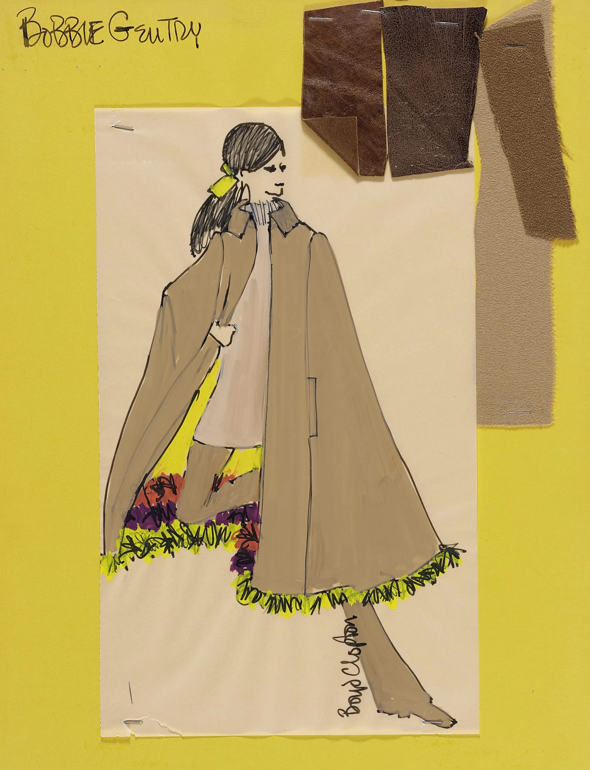 Fashion illustration in ink and marker on cream paper, mounted on yellow board, showing a figure in profile wearing a long camel-colored cape with chartreuse fringe, with fabric swatches attached