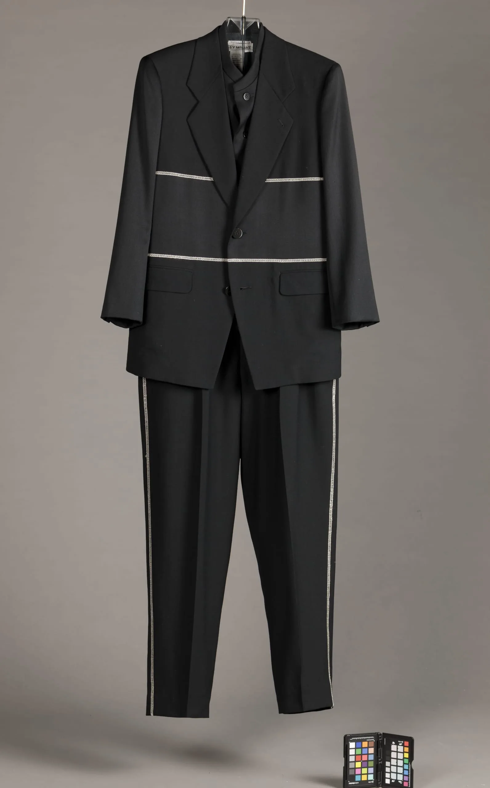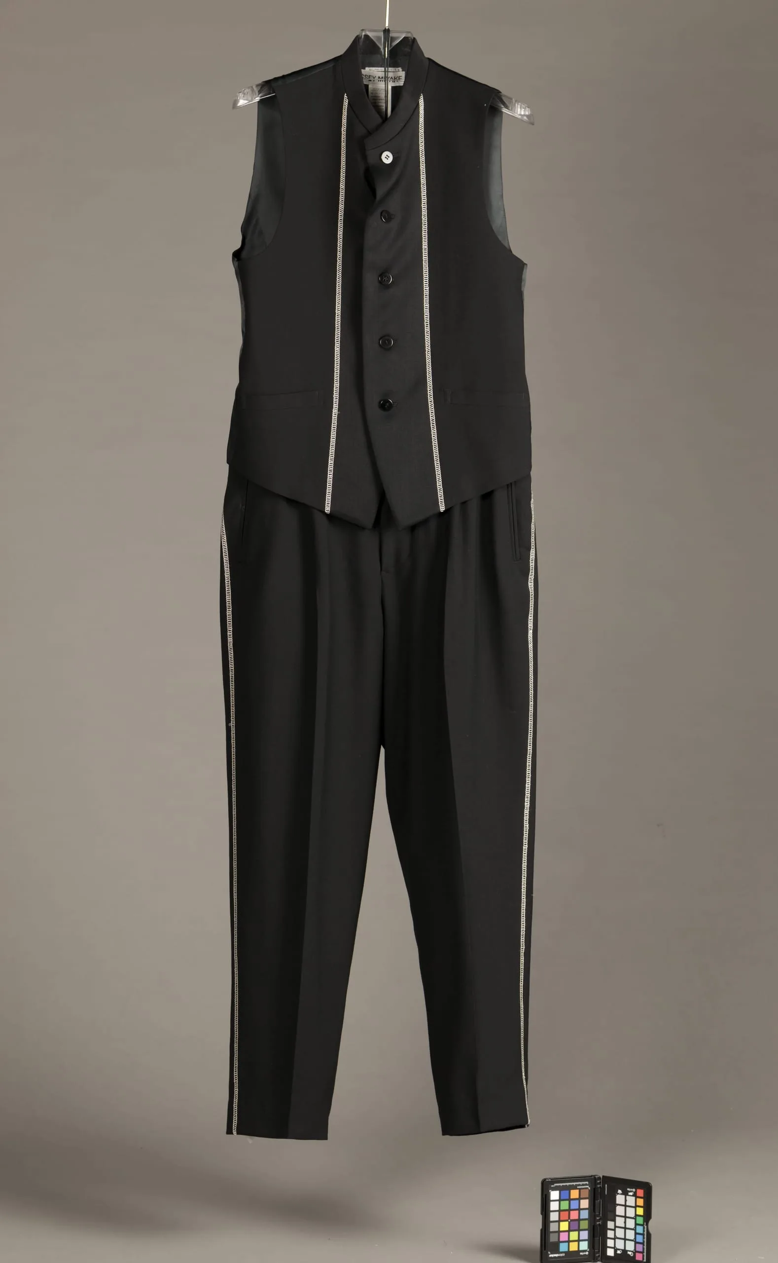 - Jacket and Vest: Wool plain weave and wool twill with rayon embroidery; Trousers: Wool plain weave with rayon embroidery