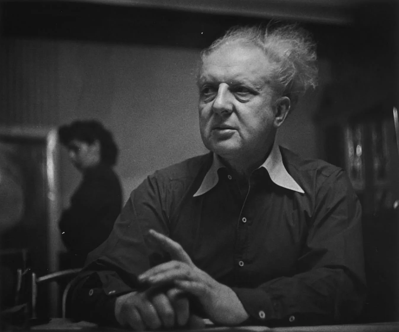 Black and white photograph of an older white man from the chest up, leaning on a surface and holding a cigar, lit from the right with a second figure blurred in the background
