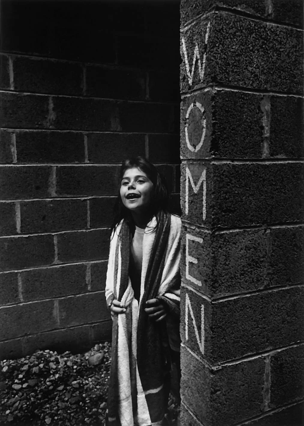 Black and white photograph of a young girl standing between two brick walls, mouth open wide, clutching an oversized cardigan, beside a pillar stenciled with the word "WOMEN"
