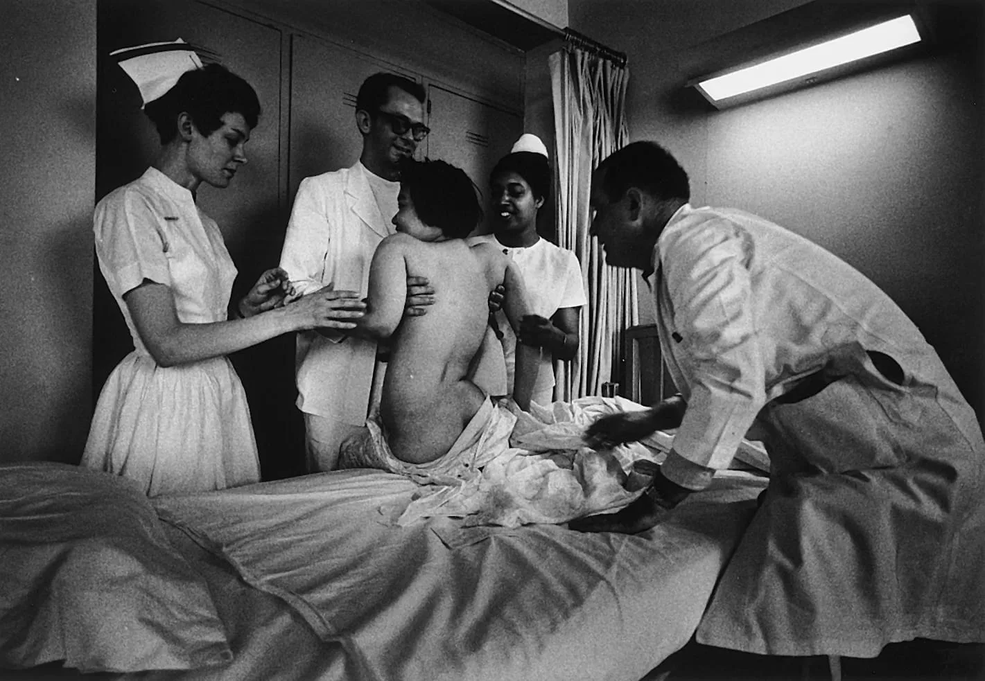 Black and white photograph of four medical workers in white uniforms gathered around a seated patient on a hospital bed, viewed from behind