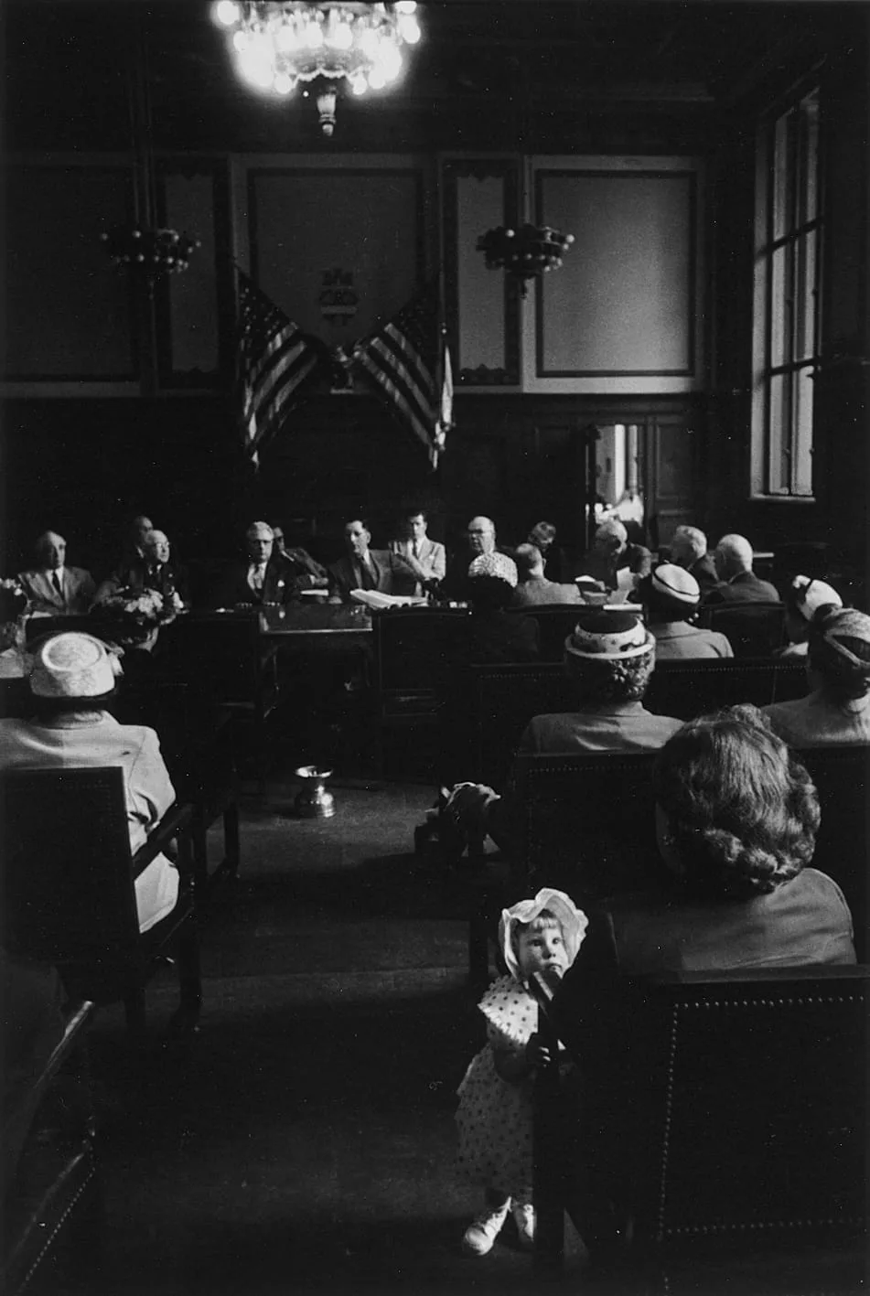 Black and white photograph of a formal hearing room with rows of hat-wearing adults facing a paneled dais, a small child in a bonnet standing alone in the center aisle facing the camera