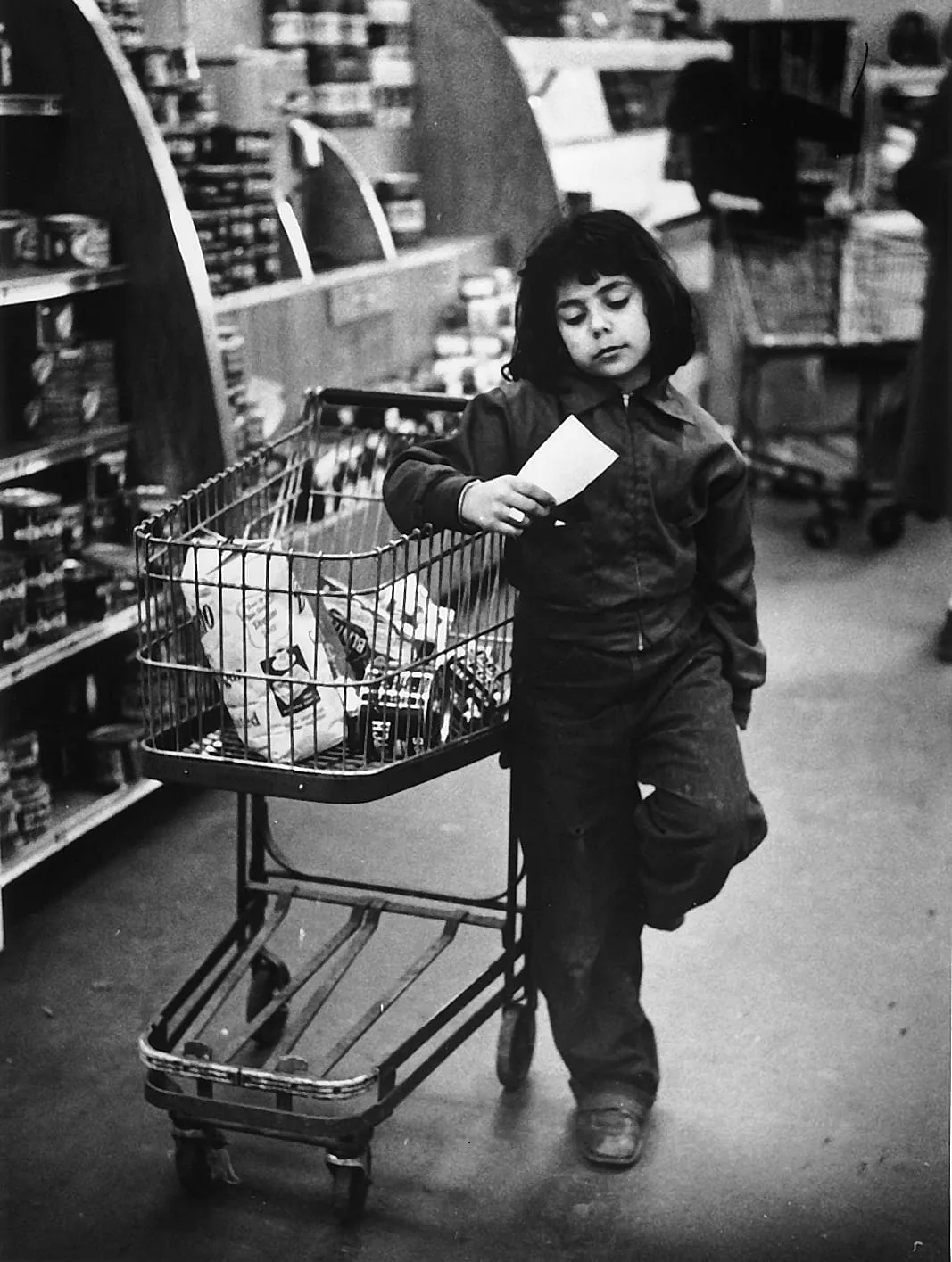 Black and white photograph of a young child standing alone in a grocery store aisle, reading a slip of paper while leaning on a full shopping cart