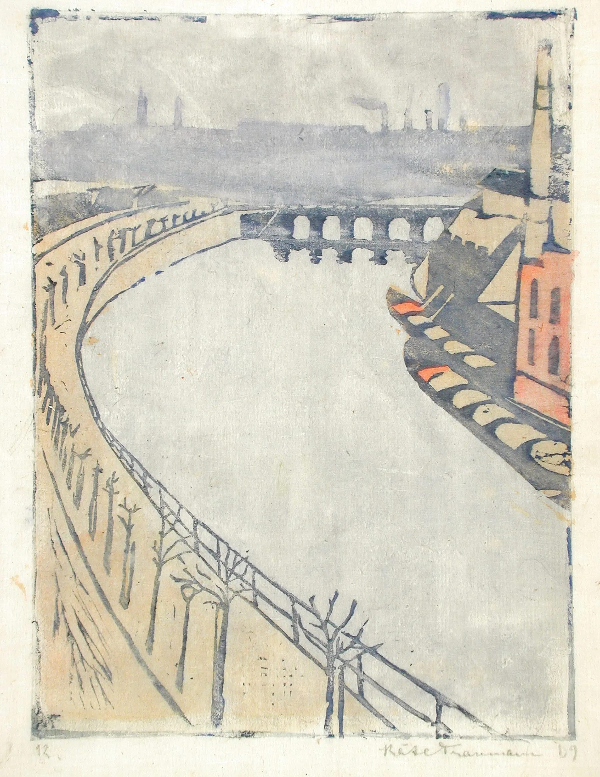 Käte Traumann Steinitz created this woodcut, a view of the River Spree, while studying art in Berlin under teachers including Käthe Kollwitz and Lovis Corinth. Here she transforms a relatively bleak winter landscape into a picturesque view that turns the repetition of bare trees and bridge arches into decorative elements.