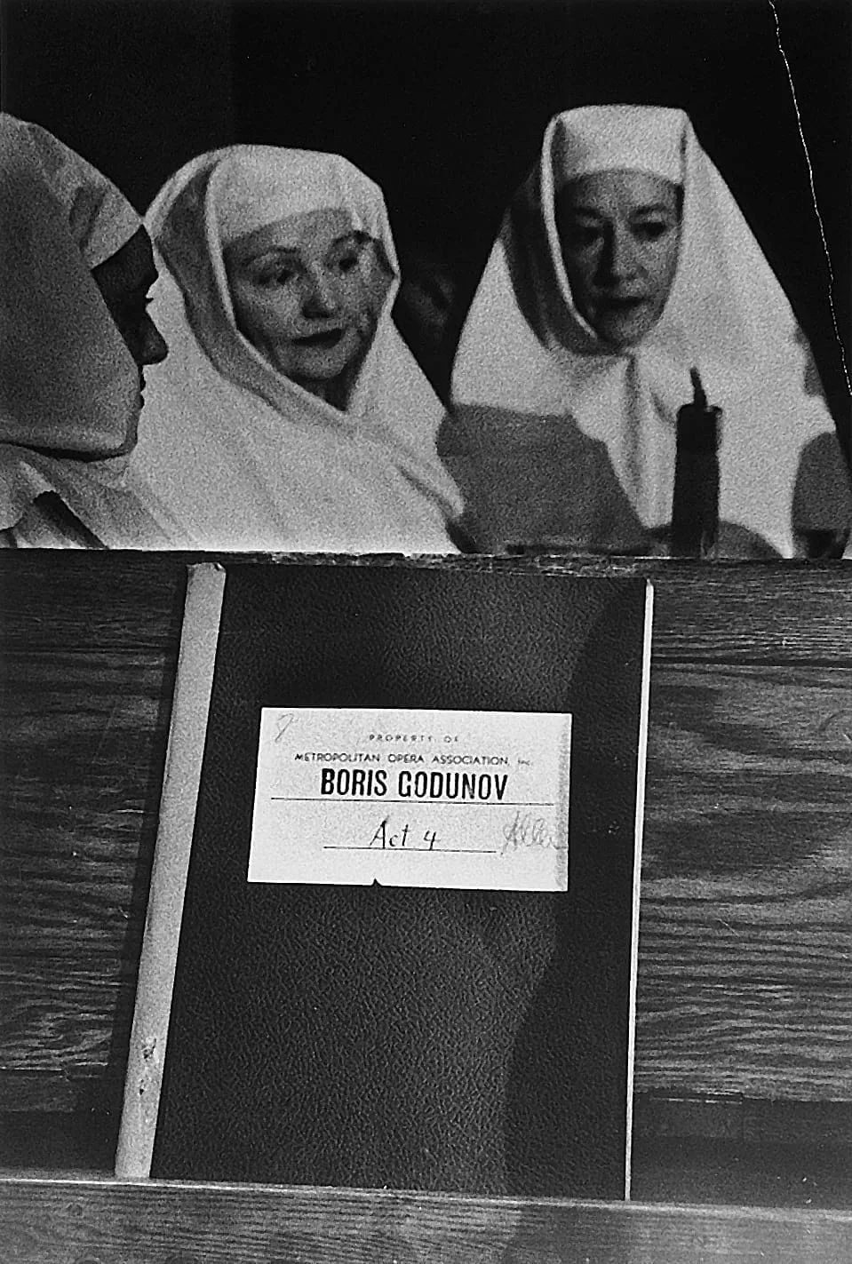 Black and white photograph of two women in nun-like costumes leaning over a wooden ledge, above a dark binder labeled 'BORIS GODUNOV Act 4' from the Metropolitan Opera Association