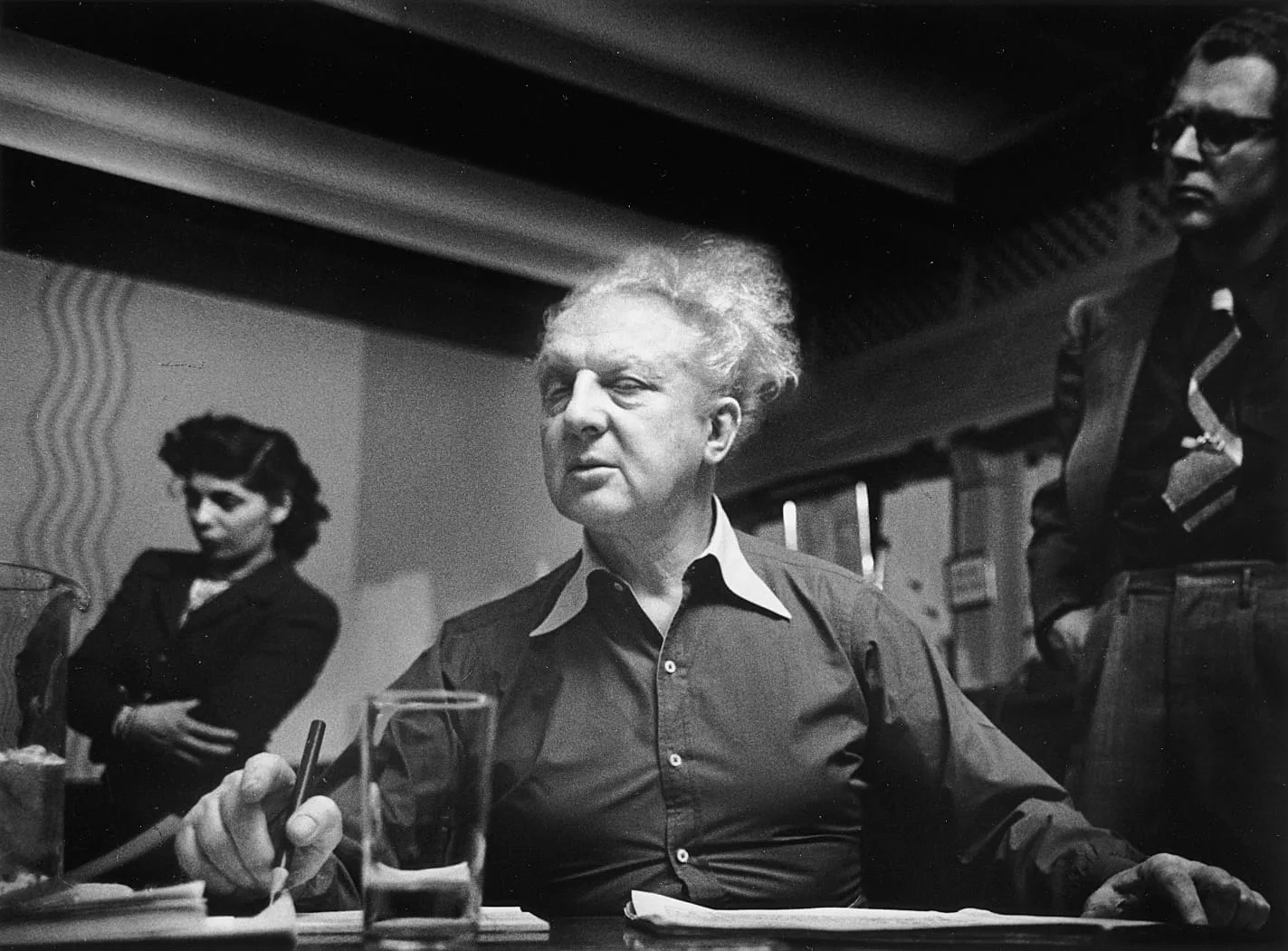 Black and white photograph of an older man with white hair seated at a table holding a pen, with two out-of-focus figures standing behind him
