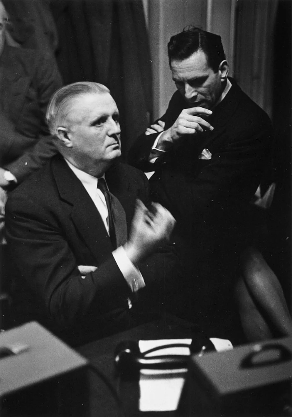 Black and white photograph of two white men in dark suits, one seated mid-gesture and one leaning over him, dramatically lit from the left against a dark background