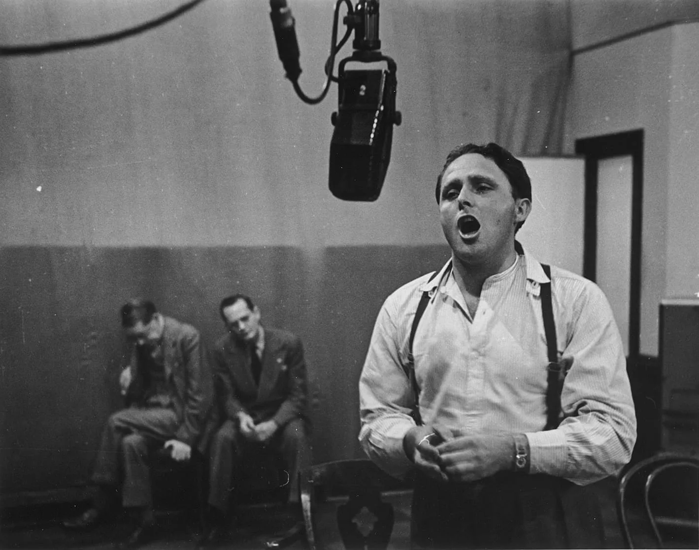 Black and white photograph of a man in shirtsleeves and suspenders singing into a hanging studio microphone, two suited men seated in the background