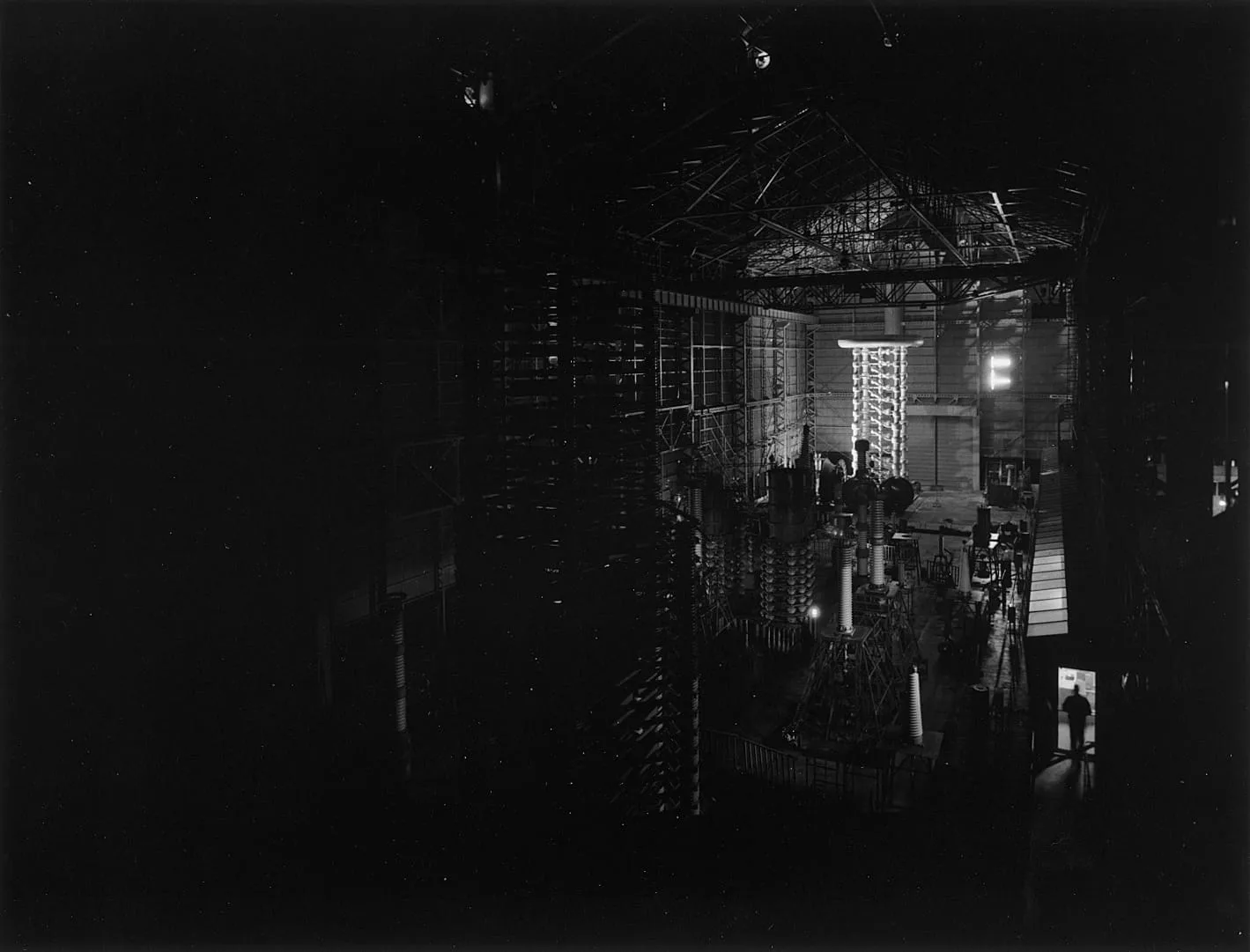 Black and white photograph of a vast, darkened industrial interior with a glowing vertical column of stacked light panels surrounded by silhouetted figures and heavy machinery