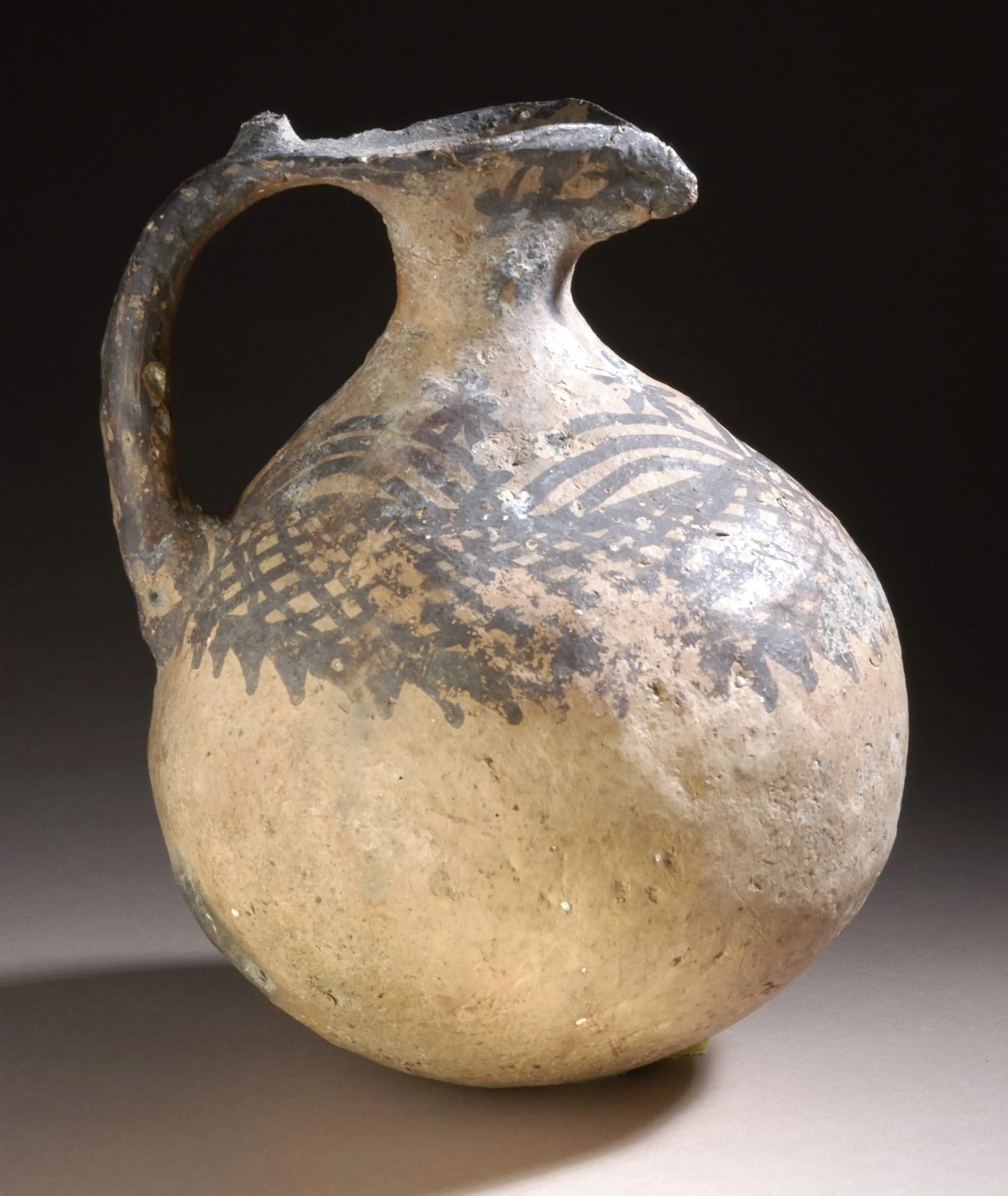 Ancient ceramic jug with globular body, loop handle, and painted shoulder decoration of frond-like motifs and zigzag border in slate blue-gray over pale khaki clay