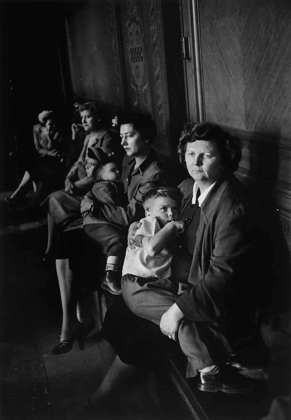 Black and white photograph of a row of women seated along a wood-paneled wall, several holding young children, lit from the upper right with deep shadows