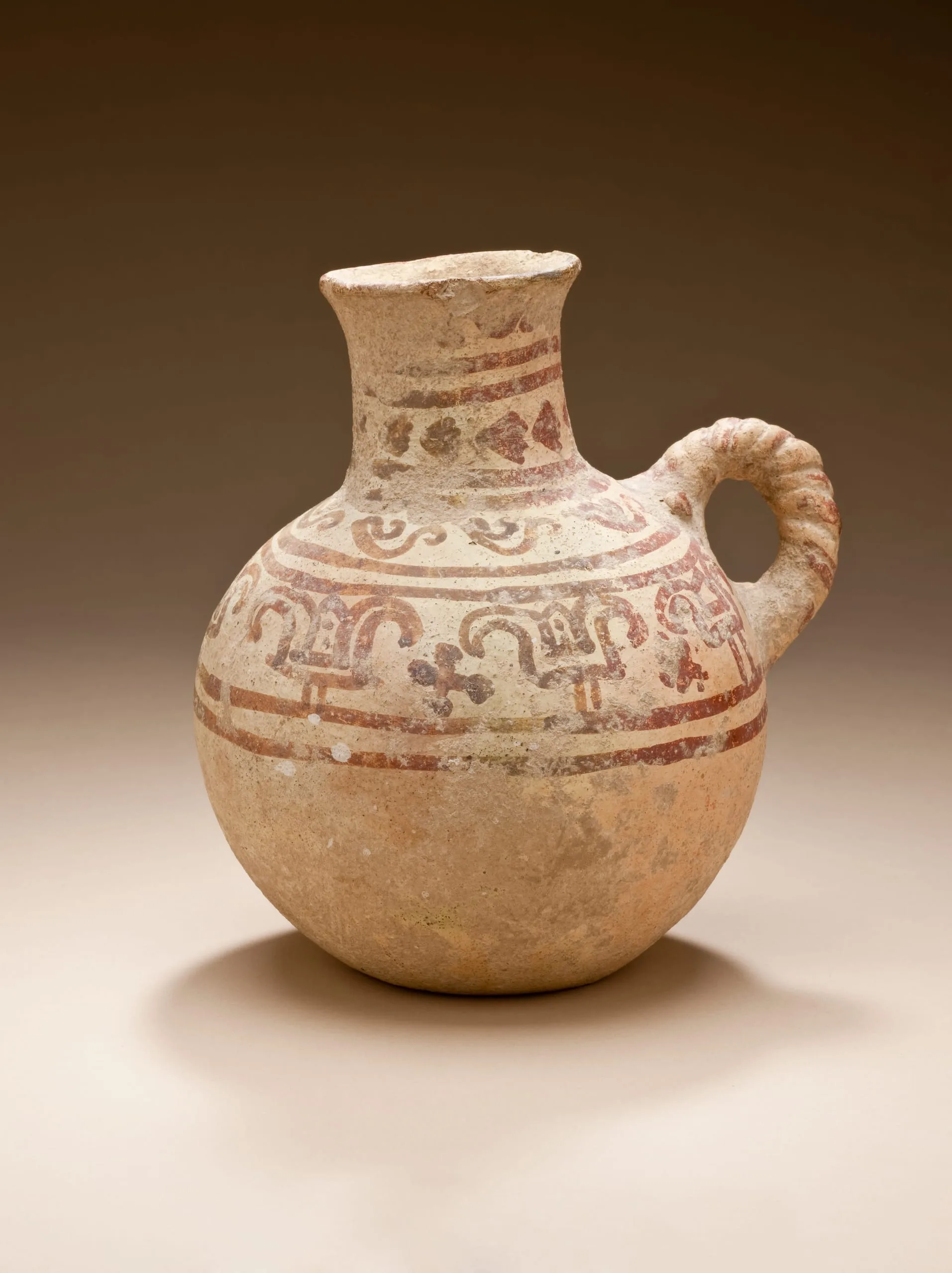 Ancient ceramic jug with a globular body, flaring neck, and twisted rope handle, decorated with rust-red painted geometric and hook-shaped motifs on a cream slip