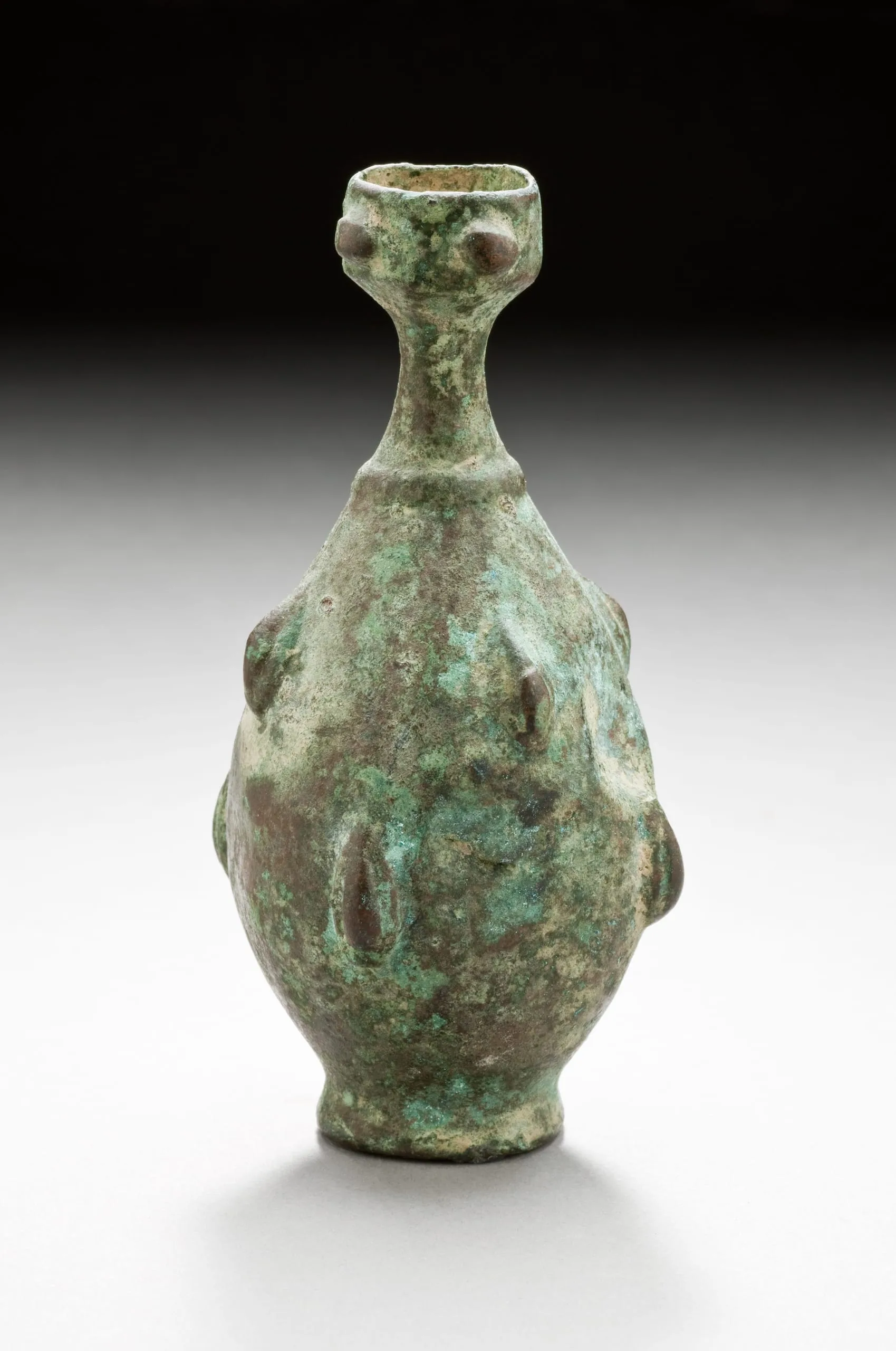 Small ancient bronze vessel with bulbous body, narrow neck, square mouth, and heavily mottled green and reddish-brown patina, with low-relief knobs suggesting a figural form