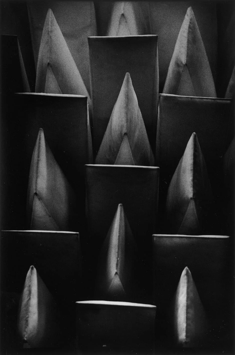 Black and white close-up photograph of densely packed agave leaves, their sharp tips lit against deep black shadows, filling the entire vertical frame