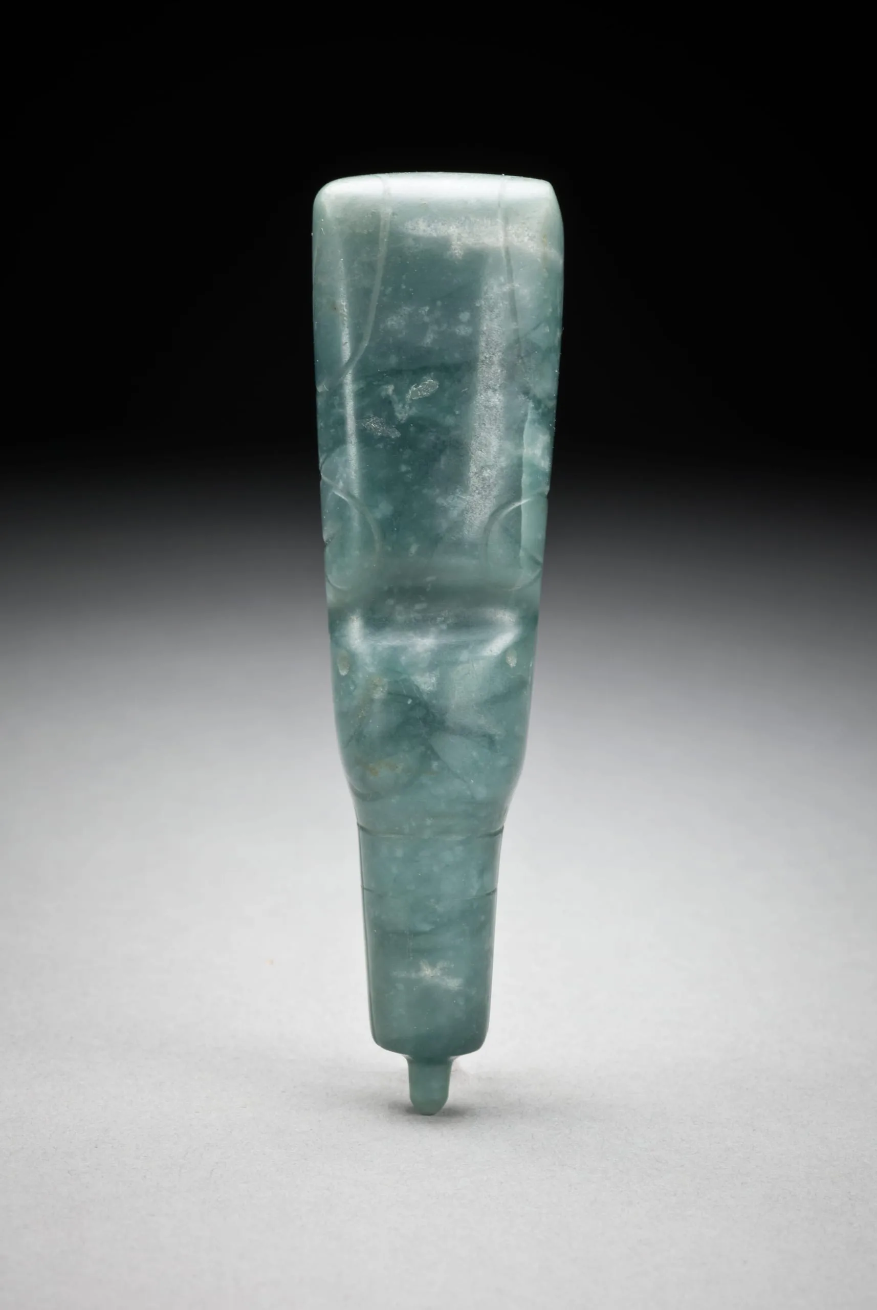 Jade object with rectangular top, tapered conical lower body, and small cylindrical base projection, carved in mottled seafoam green and milky white stone