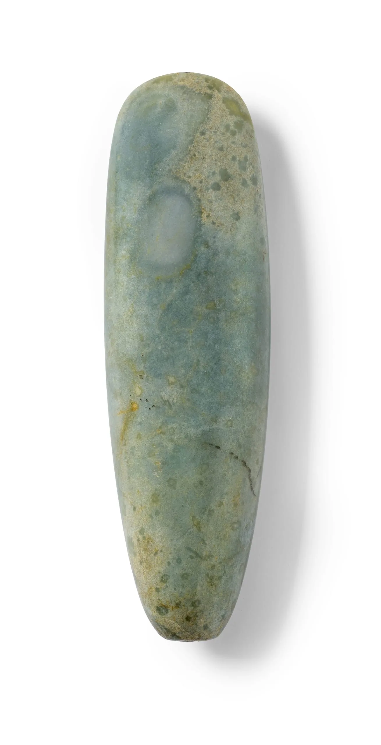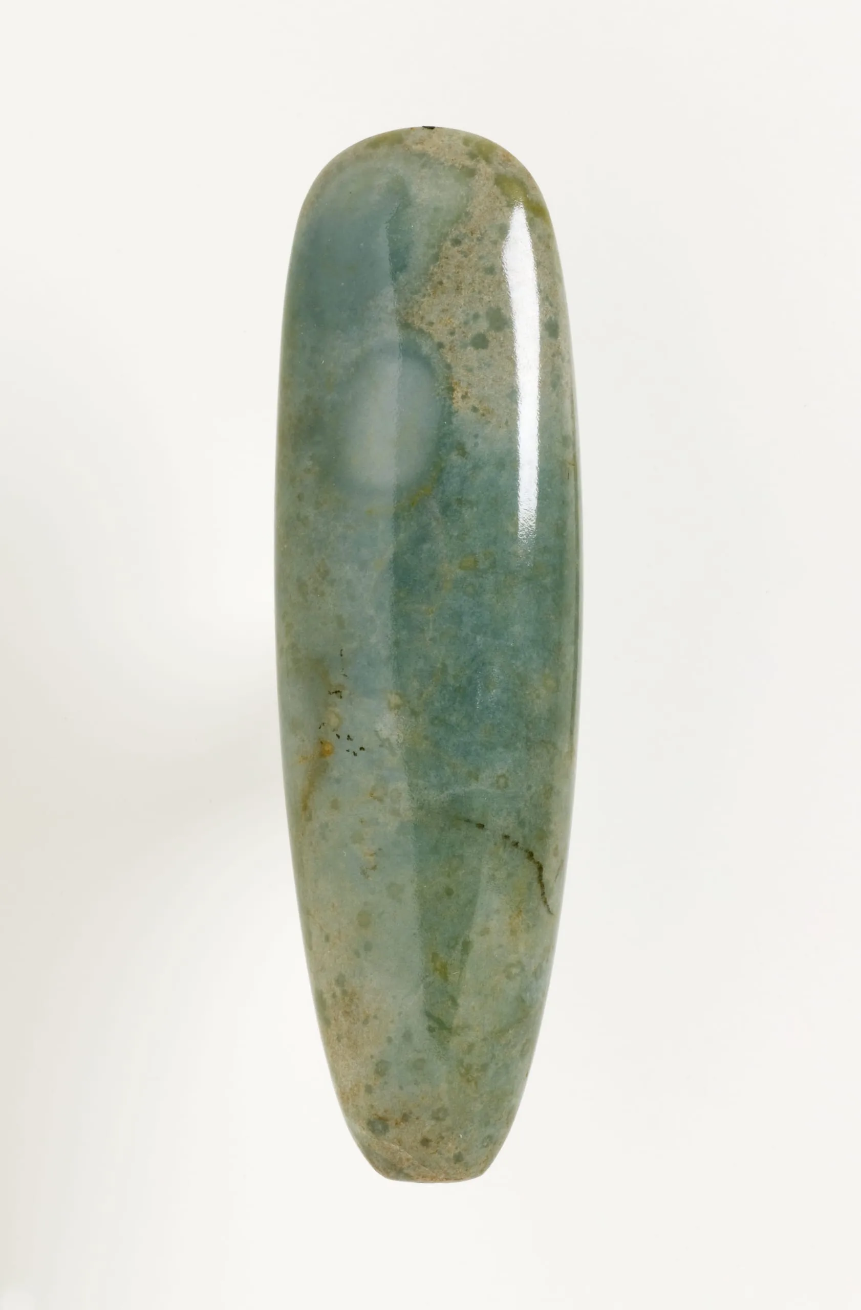 Polished jade celt of elongated oval form, tapering toward the base, with a smooth mottled surface in muted blue-green tones and natural veining throughout.