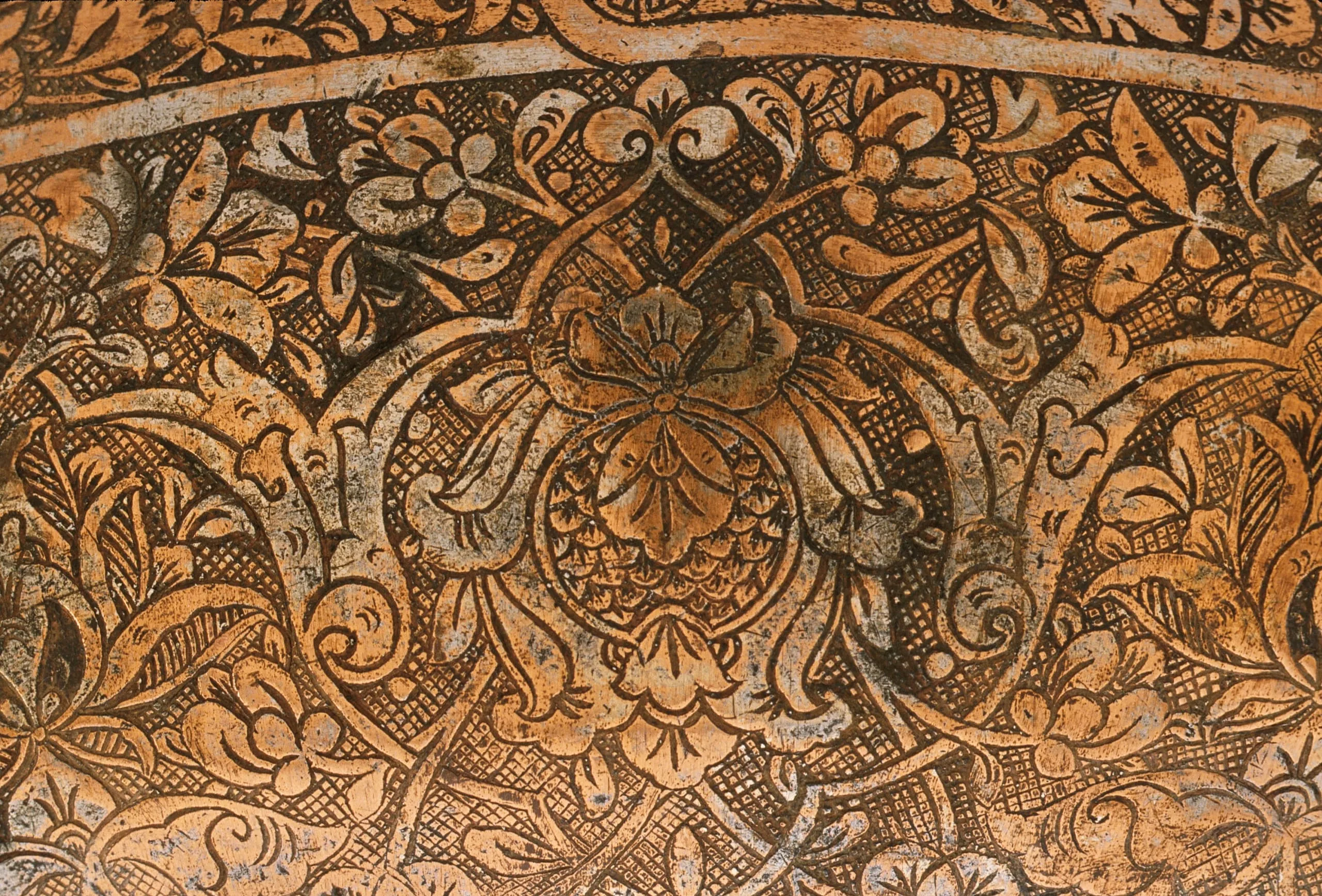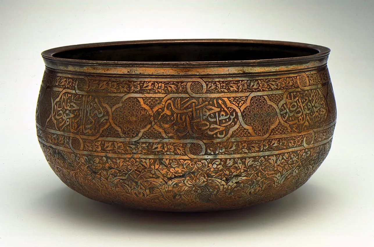 This bowl belongs to what is arguably one of the most brilliant periods in Persian art, the reign of the Timurid Sultan-Husayn Bayqara (1470-1506). Sultan-Husayn's court attracted the preeminent artistic and literary talents of the day, and Herat (in modern Afghanistan), the Timurid capital, was the focal point of this cultural efflorescence. The Timurid court is best known for the arts of the book, but the decorative arts, including metalwork, also flourished there. The museum's bowl, the decoration of which combines lush floral ornament and handsome calligraphy, typifies the artistic milieu of the period. Made of almost pure copper, the bowl was originally tinned, which produced a silvery surface that is only partially preserved. Because tin is highly resistant to organic acids, it was frequently used on the interiors of food and beverage receptacles to protect both vessel and owner. Beginning in the Timurid period, the exteriors of bowls and other objects were often tinned as well, but for a purely coloristic effect and perhaps to emulate actual silver. The bowl's boldly drawn floral and vegetal designs are among the numerous distinctive features that relate this vessel to a small group of high-quality tinned copper wares, two examples of which are dated to the year 902/1497-98. Many of these motifs, as well as the rigid symmetry of the ornament, are illustrated in a series of 15th century drawings that may have served as patterns for Timurid artists. This could explain the recurrence of the same floral and vegetal designs in nearly all contemporary media, including manuscript illuminations, bookbindings, textiles, woodwork, and stone carvings. Along with the floral ornaments, a Persian poem, in four couplets, contained within a series of eight cartouches dominate the bowl's decoration: