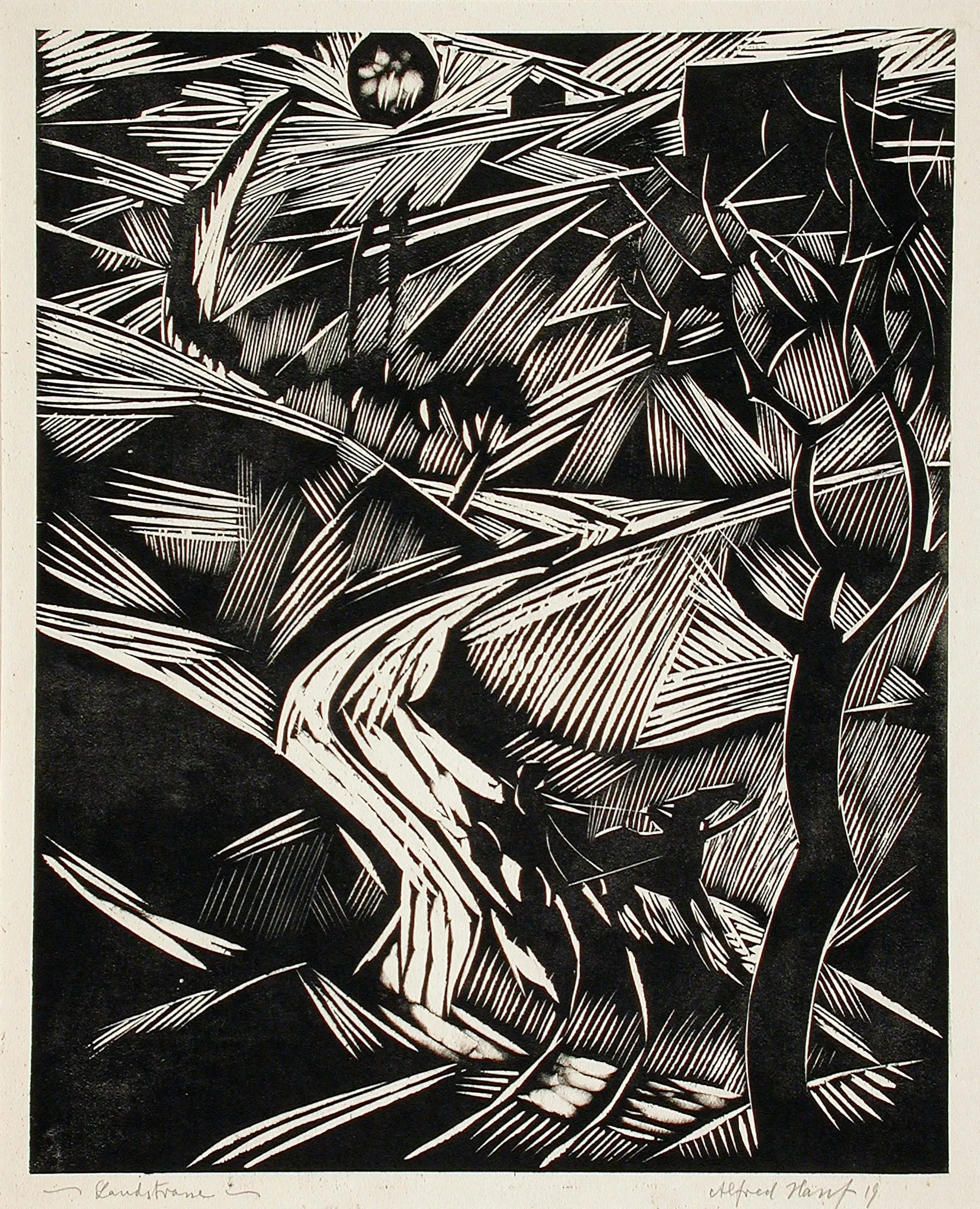 Woodcut print of an angular landscape in stark black and white, with radiating white lines suggesting jagged terrain, a winding pale path, and a curving tree trunk at right