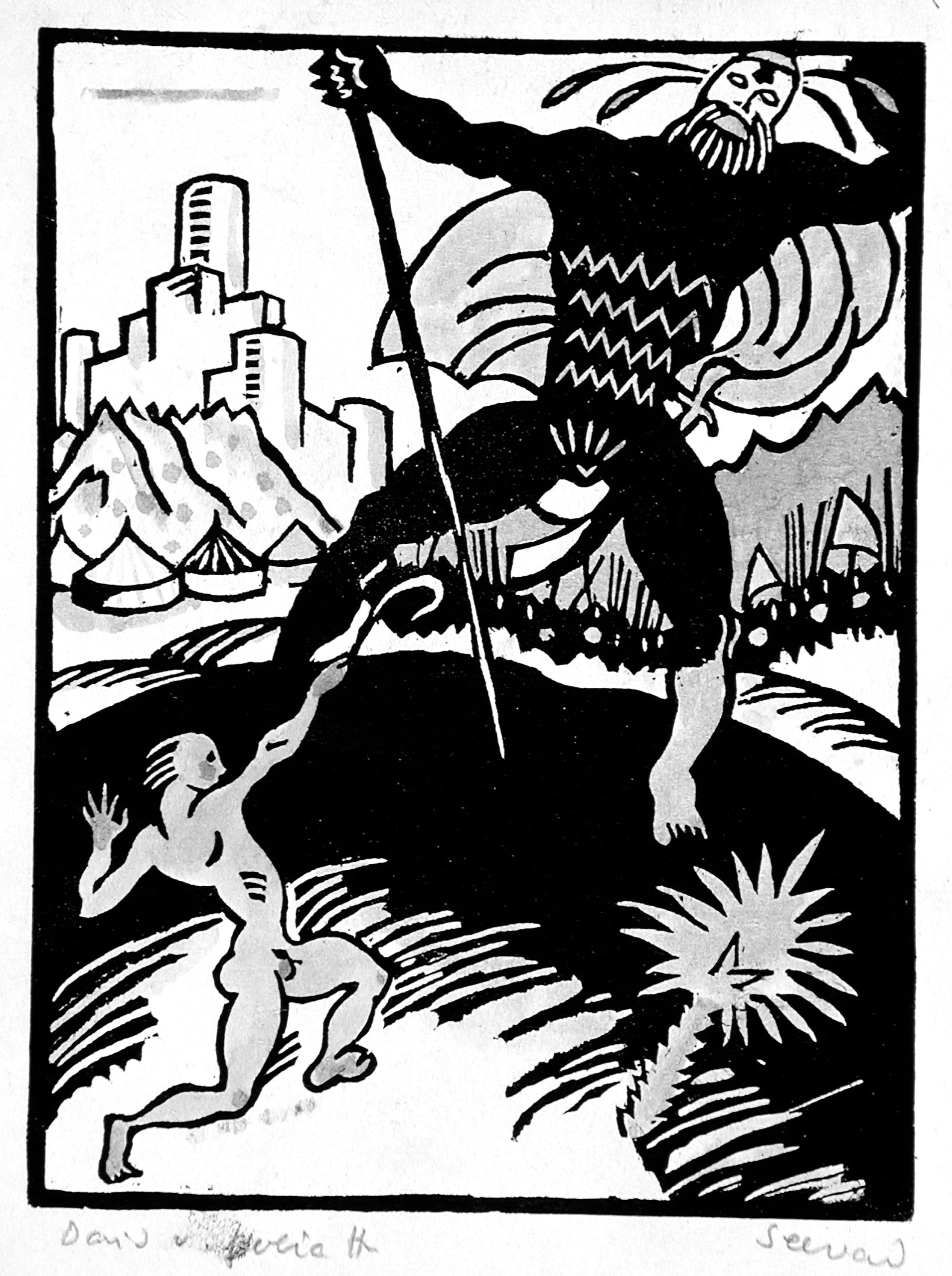 - Woodcut with gold, pink, blue and aqua watercolor on thin Japan paper