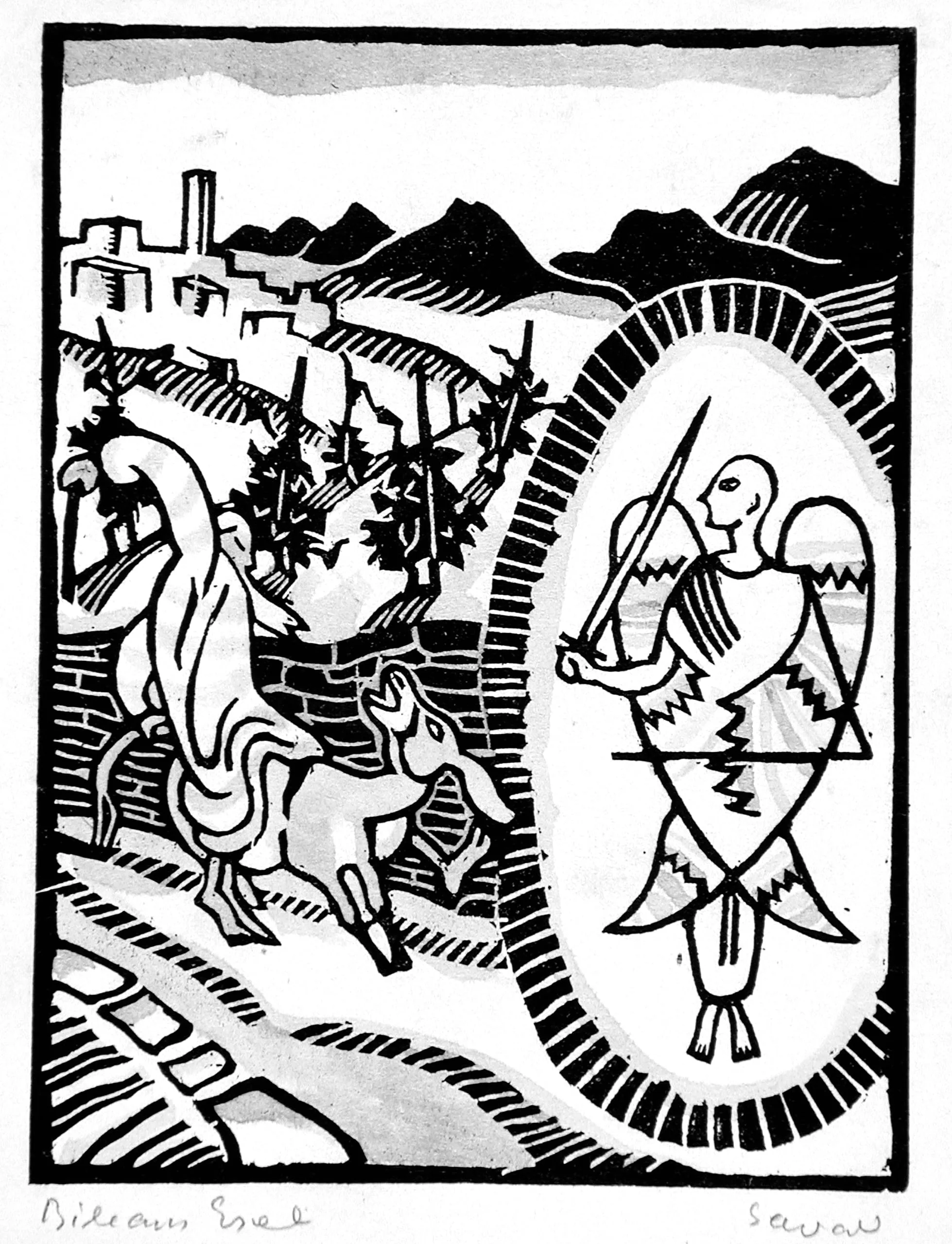 - Woodcut with blue, pink, aqua and gold watercolor on thin Japan paper