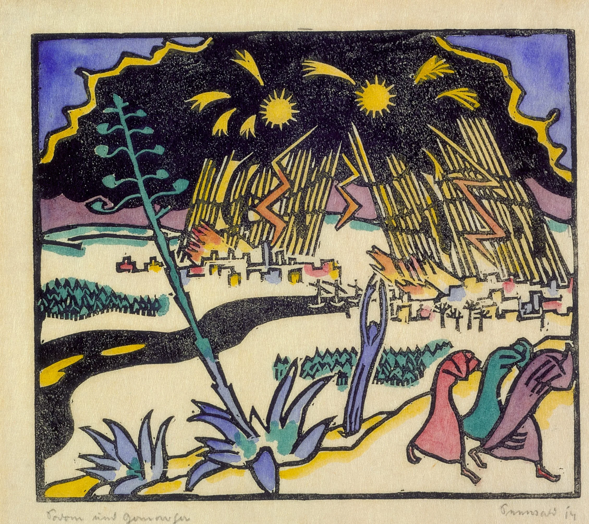 - Woodcut with blue, yellow, green, rose, and purple watercolor on thin Japan paper