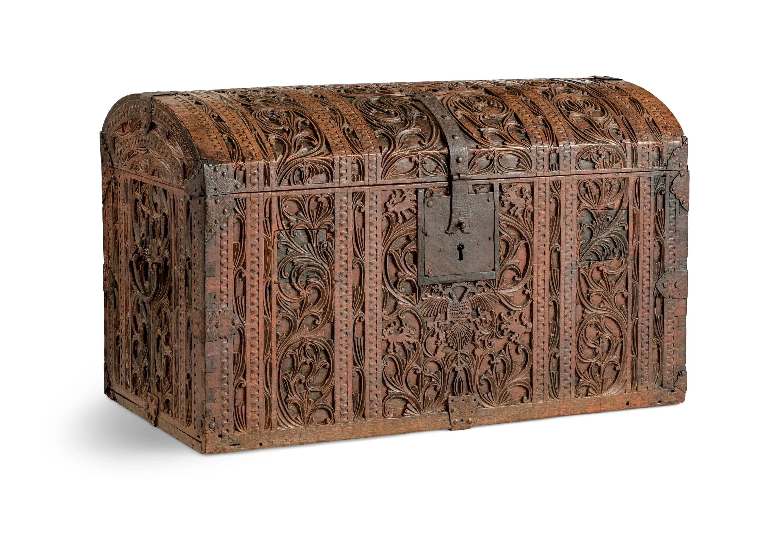Trunks were a typical product of the prosperous Manila Galleon trade. When the Spaniards arrived in the Philippines in the sixteenth century, they capitalized on existing traditions of woodcarving and an abundance of fine woods by incorporating carved decoration into newly built churches, retablos (altarpieces), and a range of luxury export goods. This travel chest bears an elaborately rendered vegetal motif across its surfaces, while the dovetail joints on the sides exemplify the dexterous artistry of the piece. Below the lock plate is a double-headed eagle—a symbol of the Spanish monarchy.