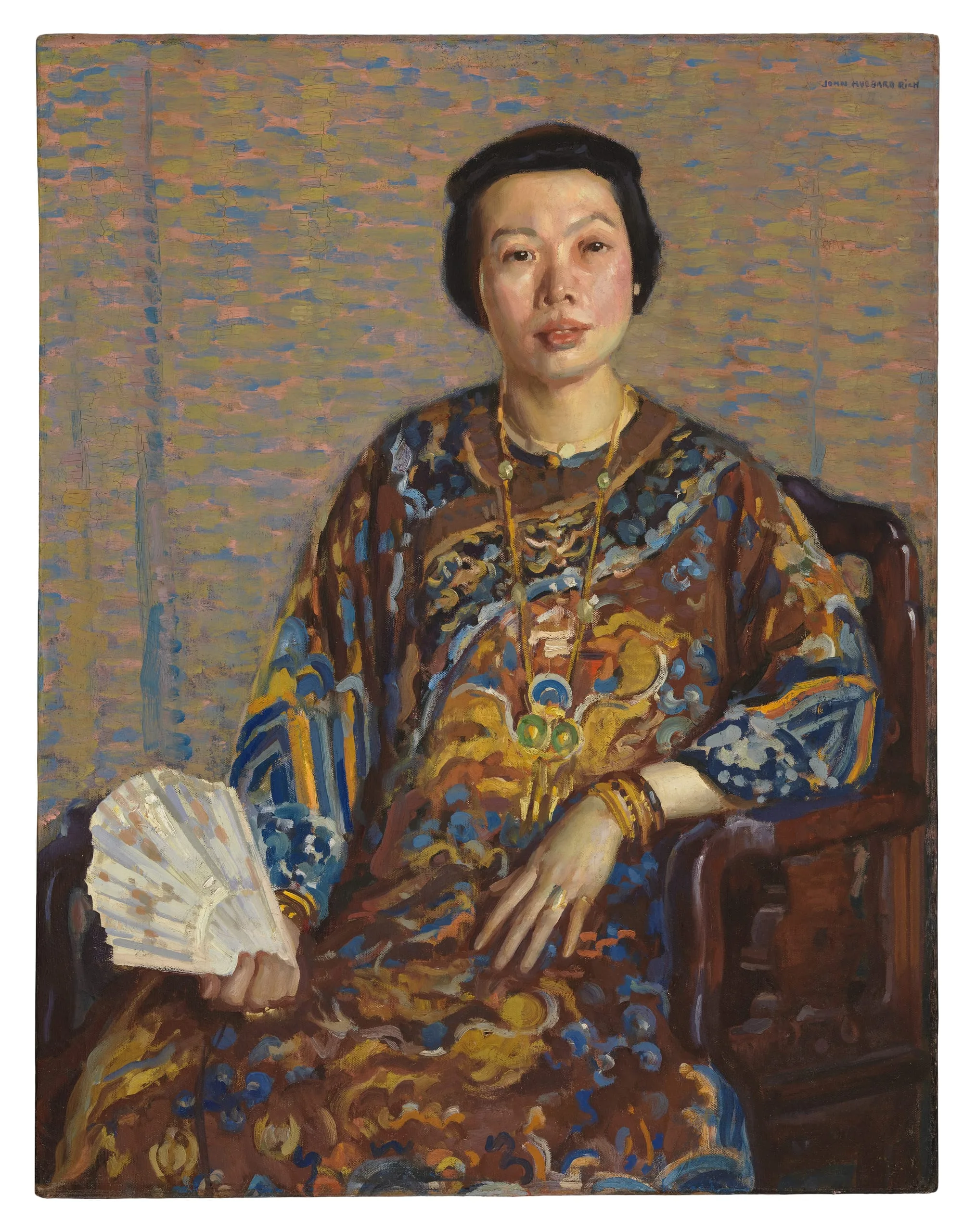 One of the leading progressives in post-World War I Los Angeles, Rich settled in southern California in 1914 after a career in Boston and New York. Although he was skilled in the style of impressionism popularized by his teacher, Edmund Tarbell, within a few years his work had evolved beyond this training. The figure in Mme Yup See is fully realized within a traditional approach to modeling and draftsmanship, yet Rich’s postimpressionist handling dominates the picture. The background flickers with long horizontal streaks of pink, ultramarine blue, and yellow, sparkling hues that echo the deeper colors of Mme See’s attire.