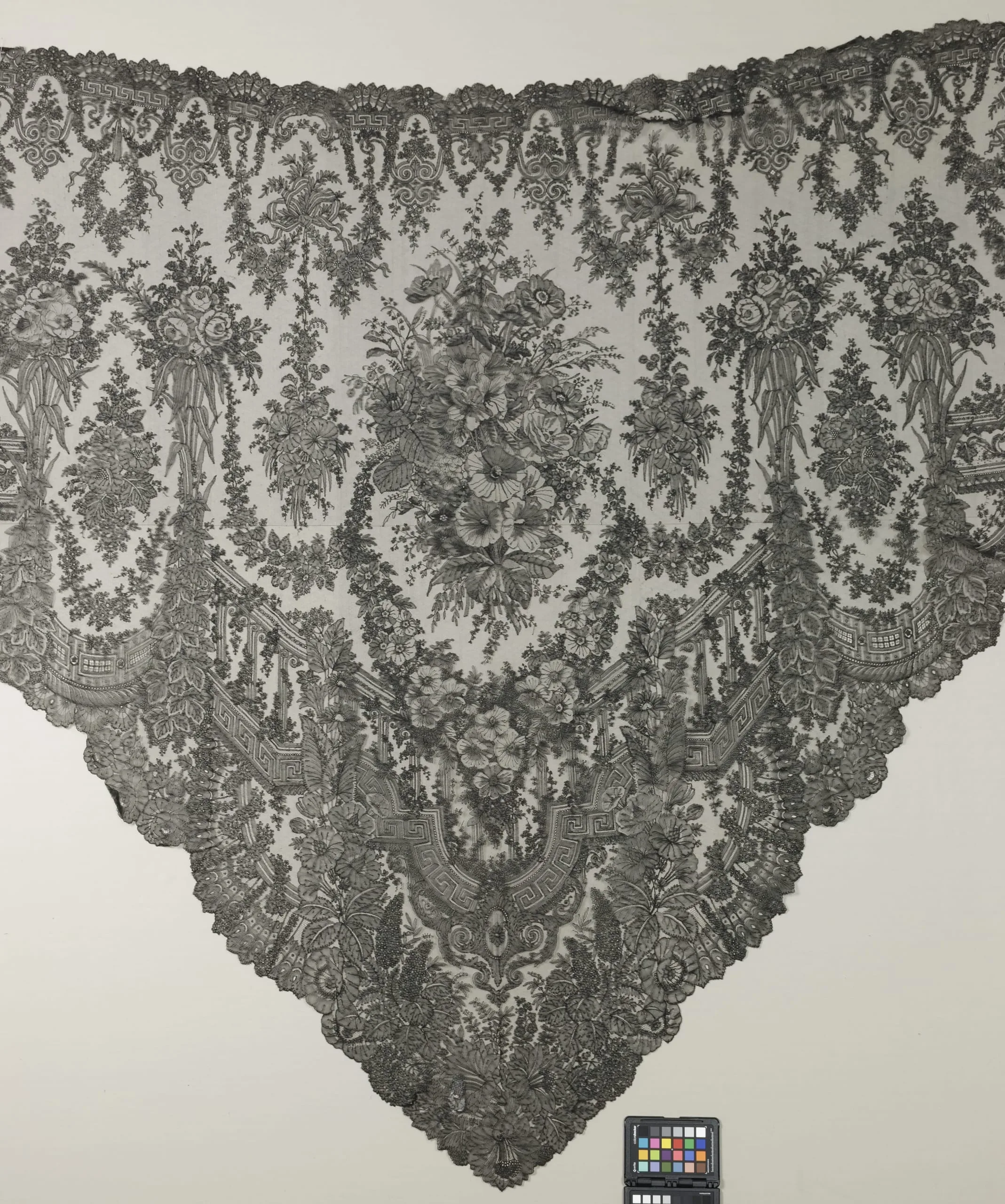 Large triangular black bobbin lace shawl displayed flat, with dense floral bouquets, scrolling vines, and architectural cartouche motifs on a fine net ground