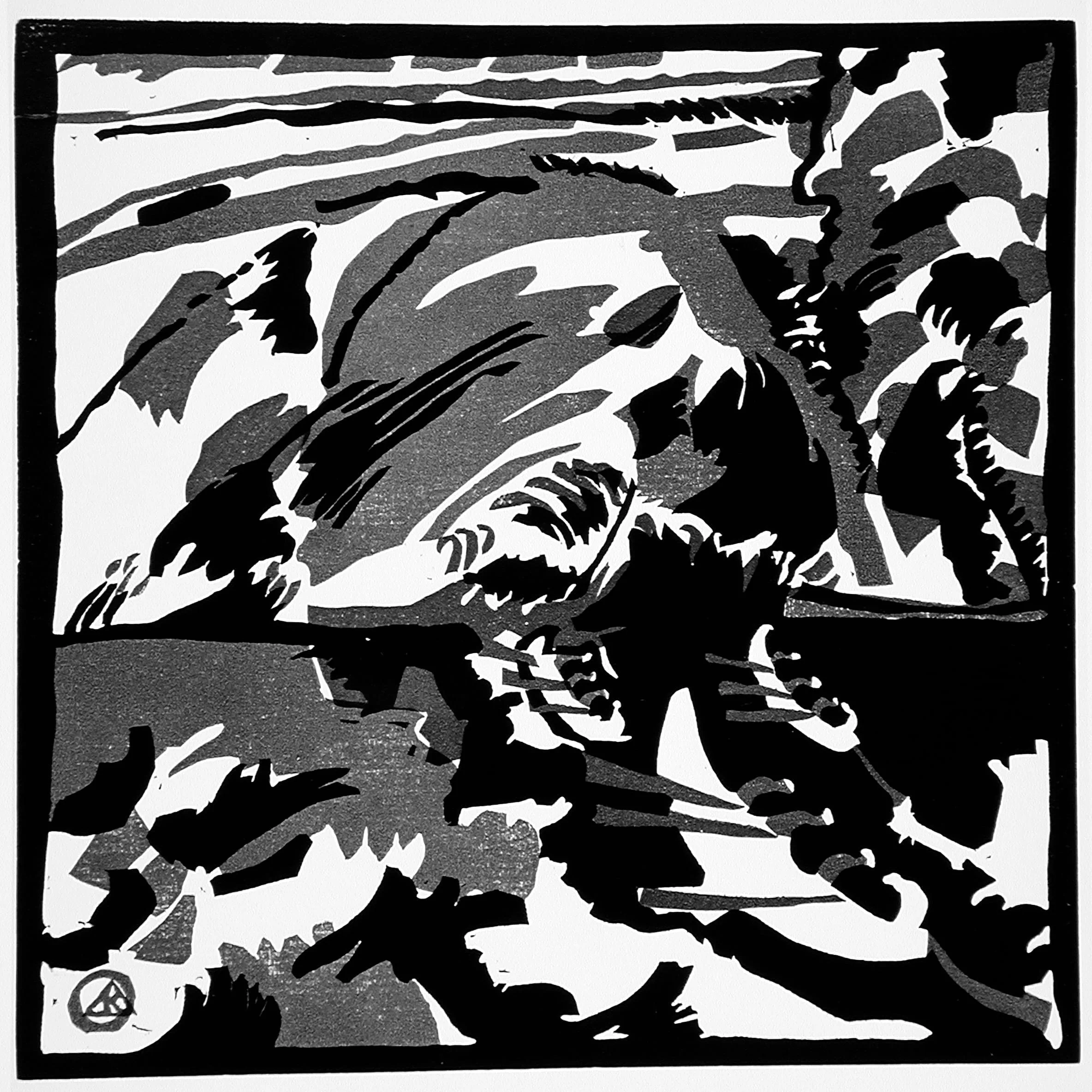 - Woodcut printed in red, dark violet, and black on Van Gelder paper
